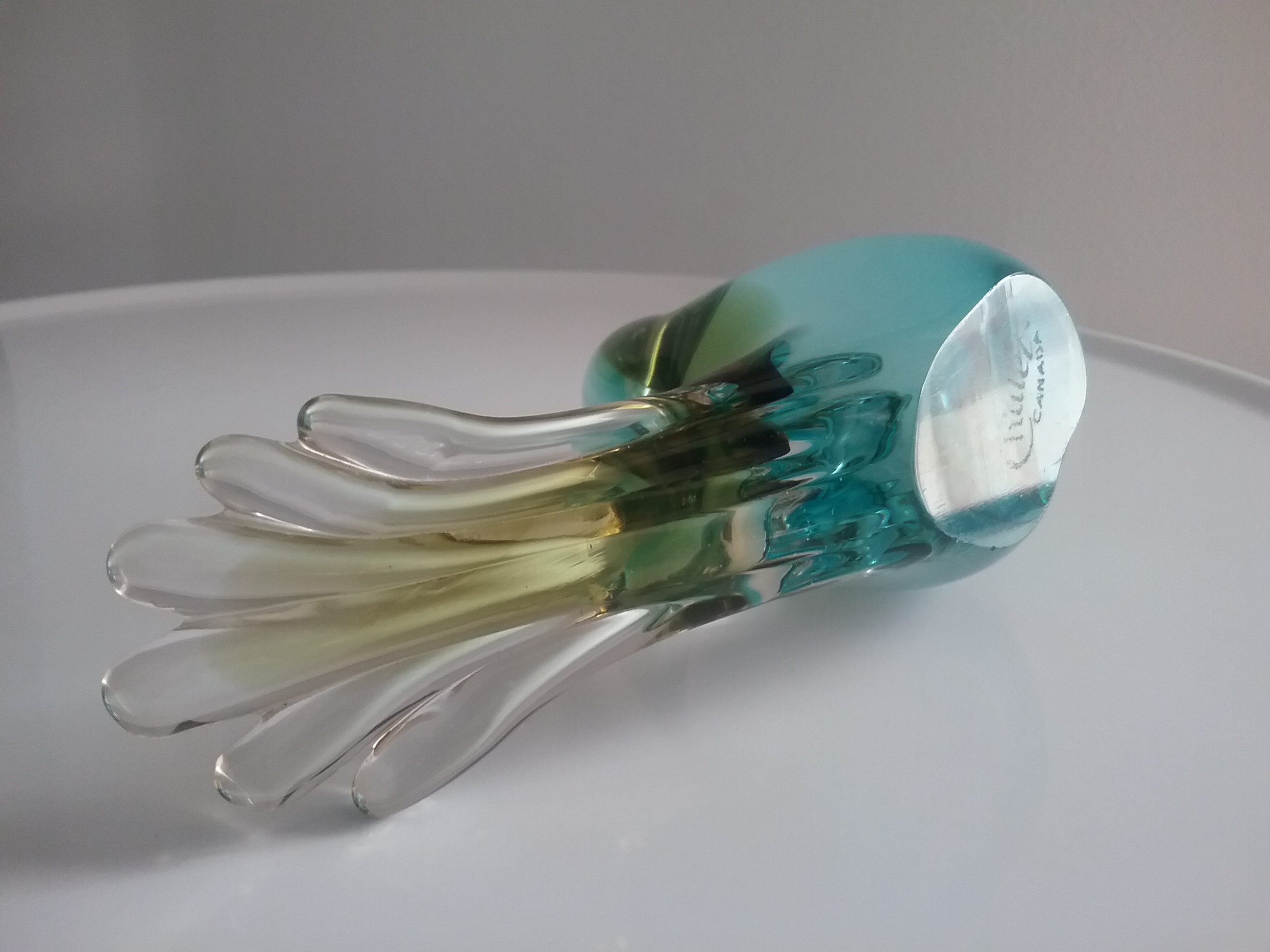 Here is a 4"H x 5"W blue & green-gold sommerso blend on clear glass songbird with fantail by Chalet Glass of Ontario Canada made between 1962-1975. Etch signed on bottom, this bird was Chalet item #703