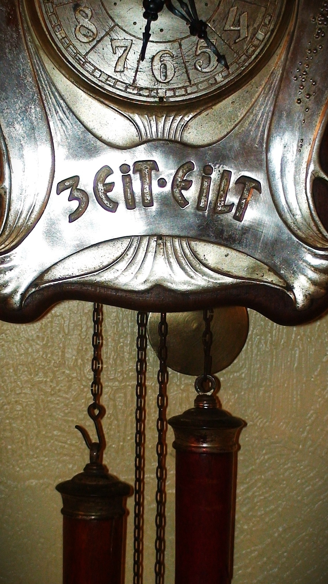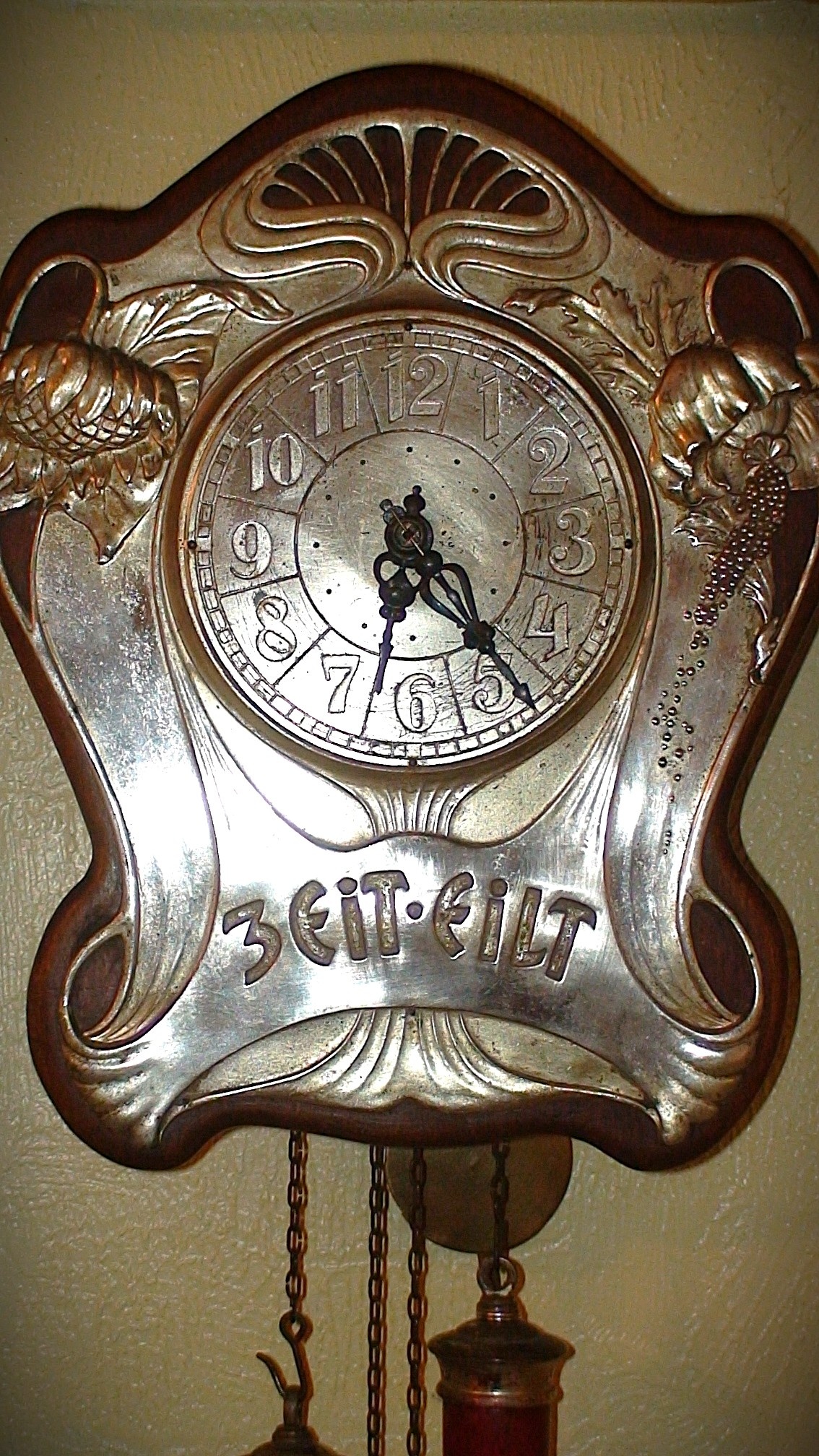 An antique German Jugendstil wag-on-the-wall style hanging clock with exposed weights and pendulum. It is decorated with a brass embossed face displaying the phrase “Zeit Eilt” ("Time Flies")