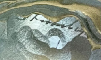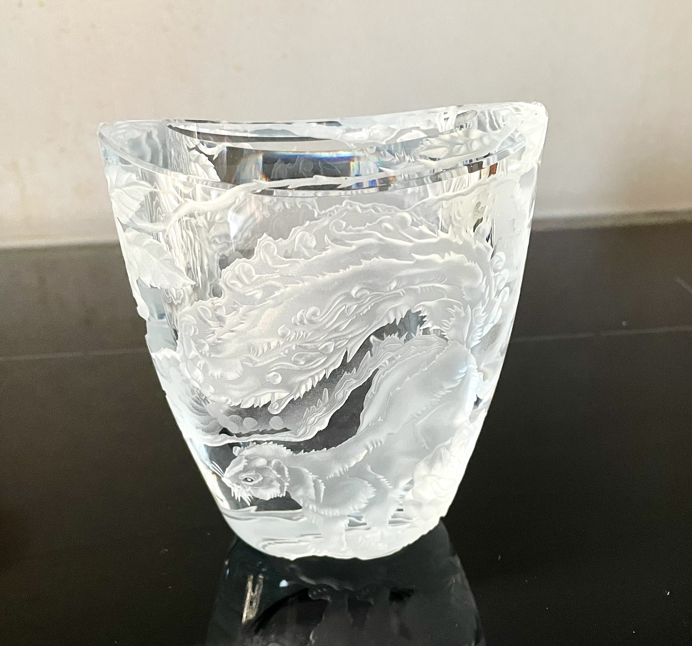 Gorgeous, glass/crystal vase…deeply carved in places and possibly sandblasted. Signature on bottom…and side too with 1976. About 5 inches high..very thick.