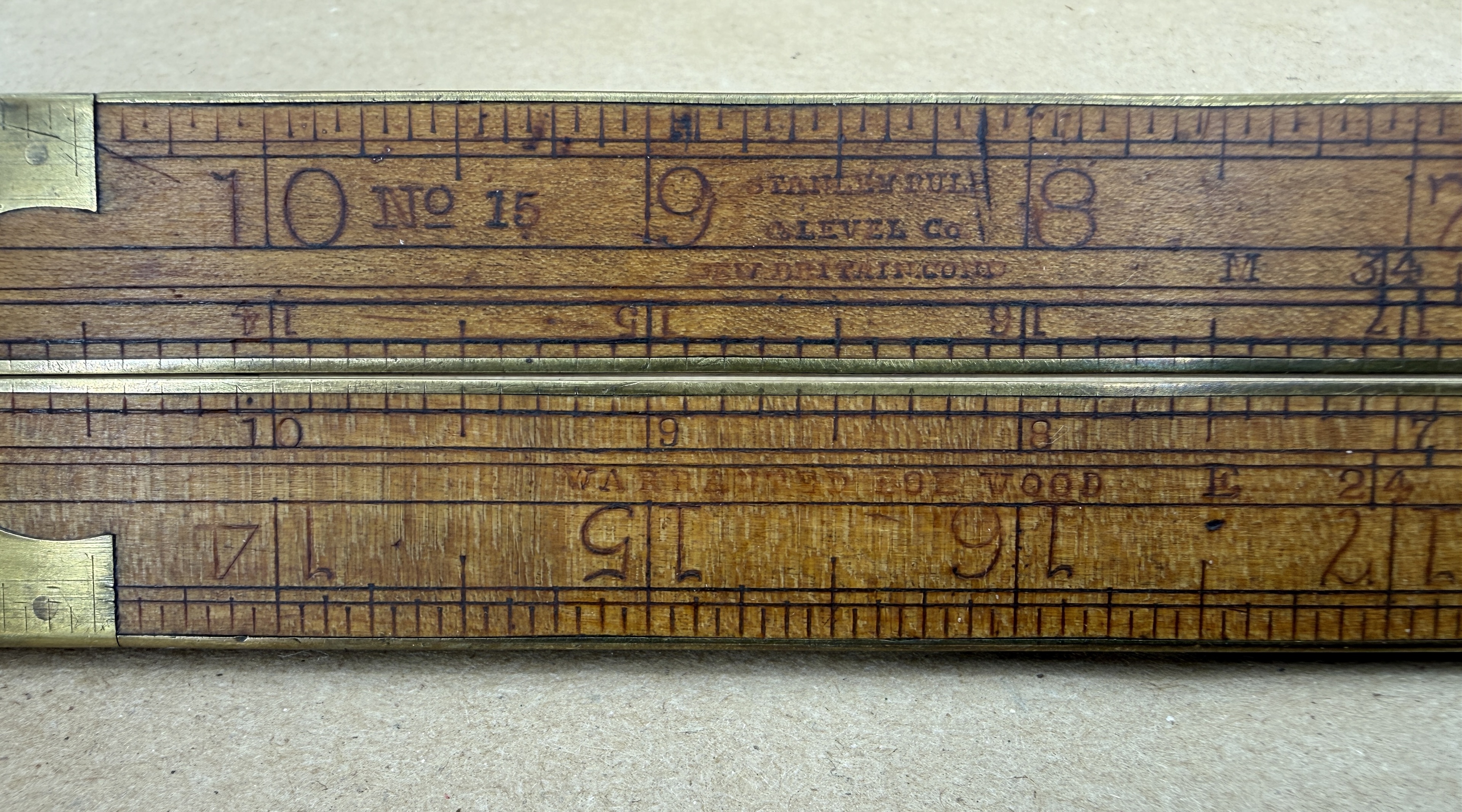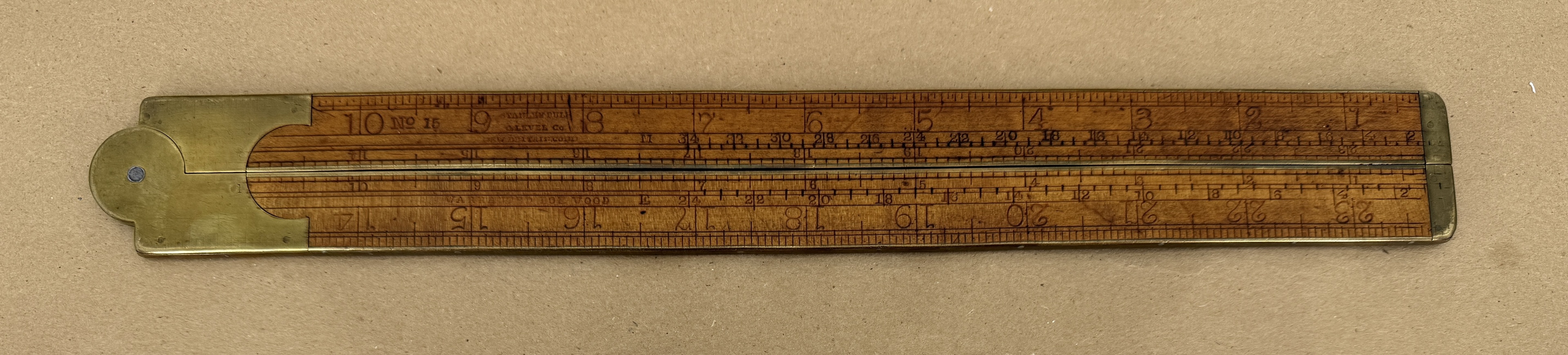 Beautiful 1854-1915 Stanley Rule & Level Co. No. 15 carpenter’s two-foot, bi-folding and brass-bound, Boxwood rule. Marked: “No. 15 Stanley Rule & Level Co. New Britain, Conn. Warranted Boxwood.”