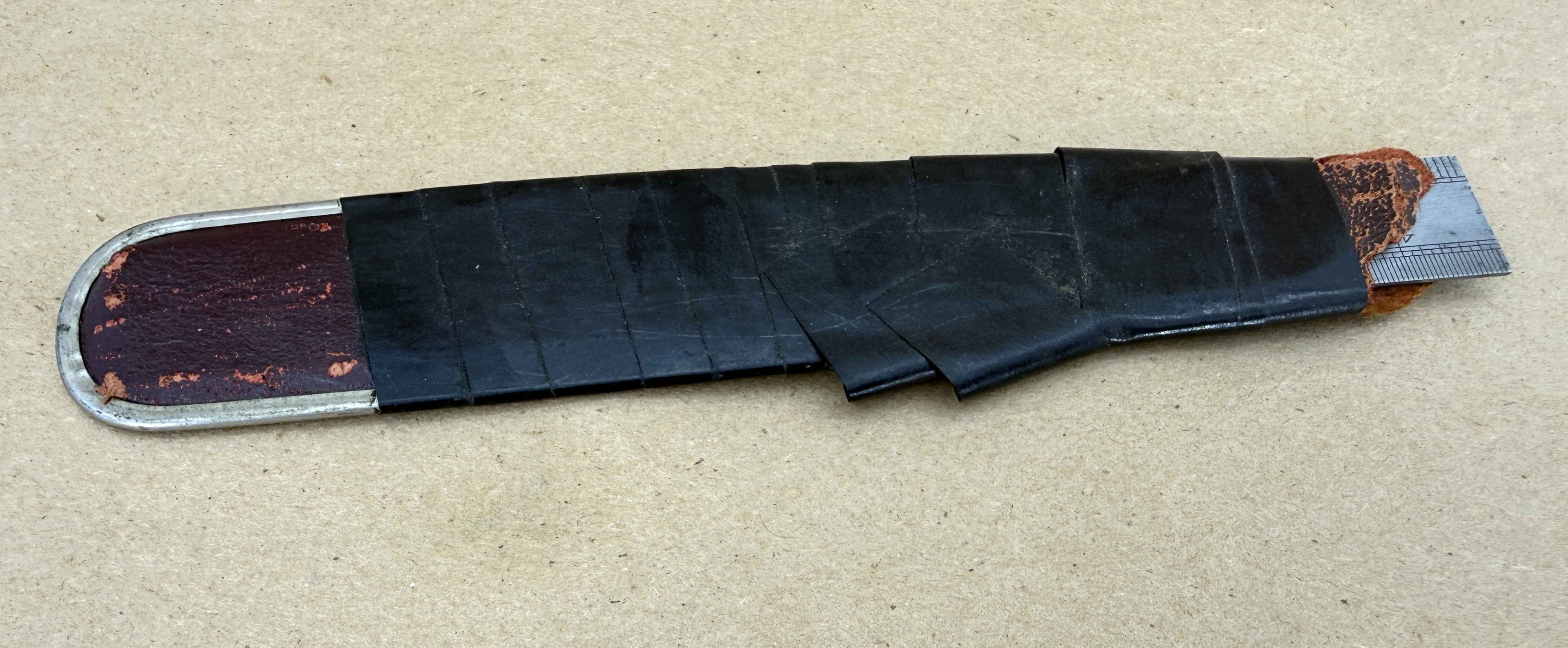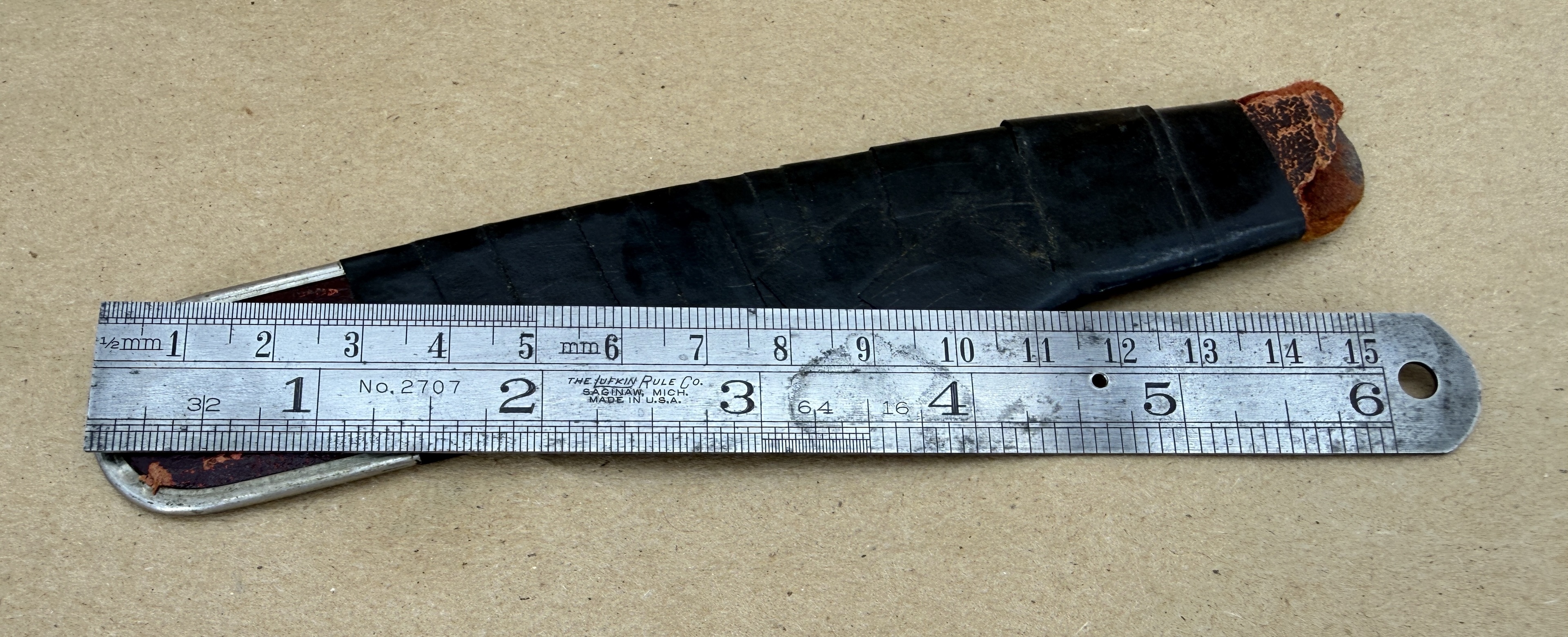 While the previous owner obviously took good care of the Lufkin No. 2707 6" (English Pattern) steel rule, it appears he barely maintained a functional leather sheath.