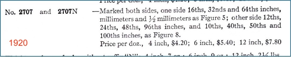 The No. 2707 is marked both sides: One side 16ths, 32nds, and 64ths inches, millimeters and 1/2 millimeters; Second side 12ths, 24ths, 48ths, 96ths inches; and 10ths, 40ths, 50ths and 100ths inches.
