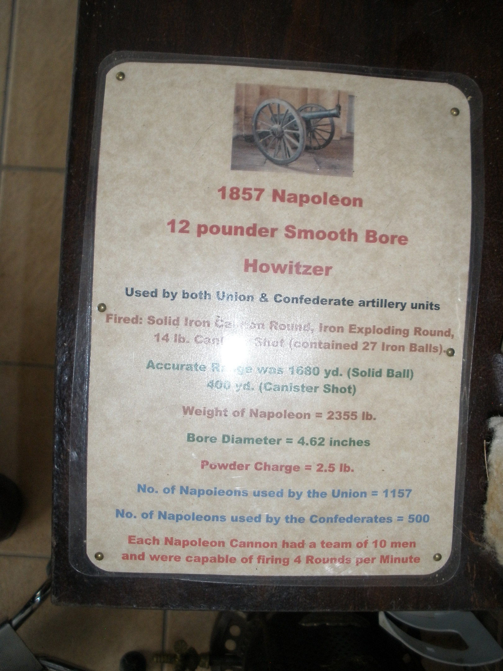 The full-sized Civil War Napoleon Howitzer fired an exploding shell for over 1600 hundred yards, and if the enemy was close enough, they used "canister" which held about 75 iron balls 3/4" in dia. Canister shot could wipe out a 50 yd. line of enemy 400 yards away. The Napoleon was a most devastating and effective artillery smooth bore howitzer that both sides used.