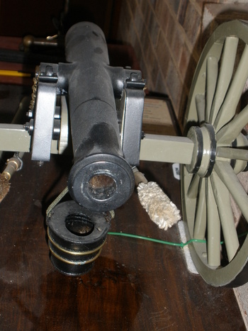 I load this cannon with 100 grains of 2 F black powder. The powder is rolled into an aluminum slug and rammed down the bbl. A wad of damp newspaper is then rammed down the bbl. and a brass pricker is pushed down the fuse hole to open the path for the fuse. A fuse is then inserted. It is now ready to fire. (I never fired a projectile).
