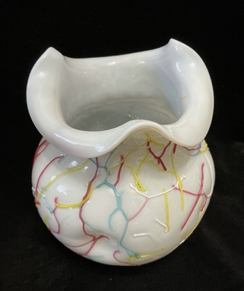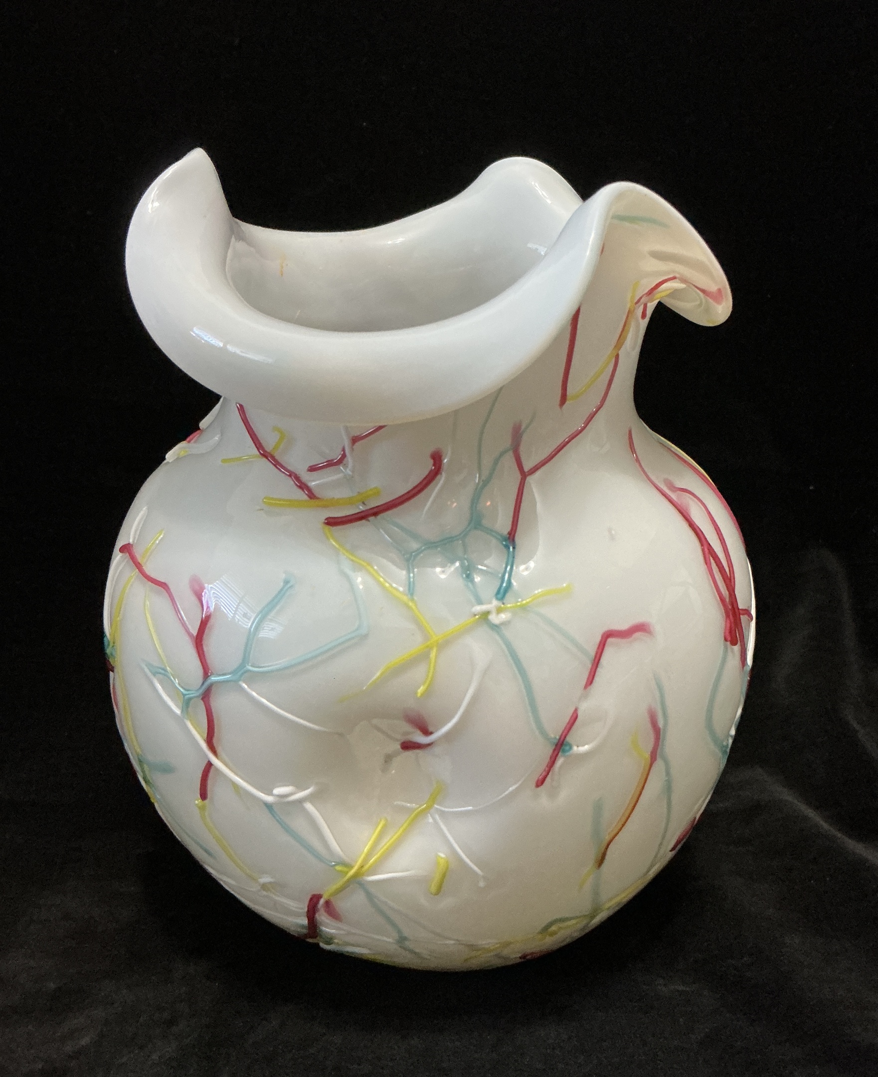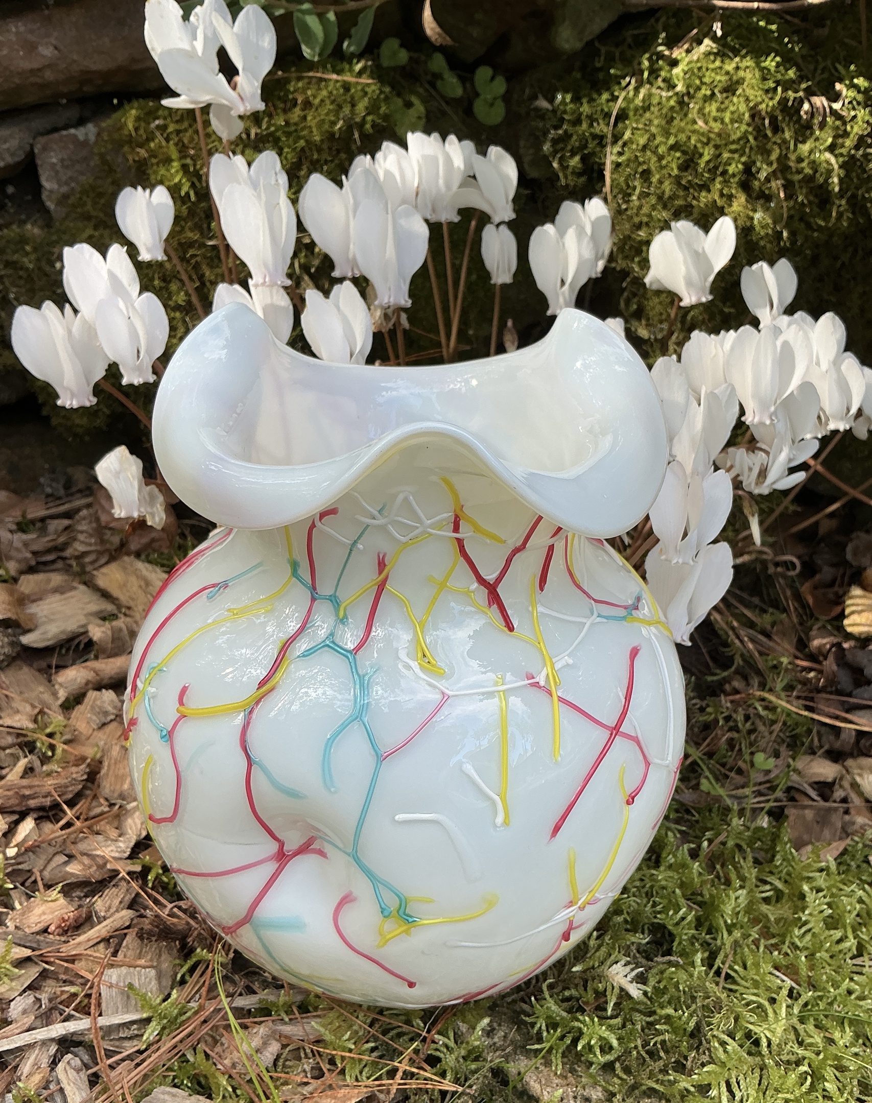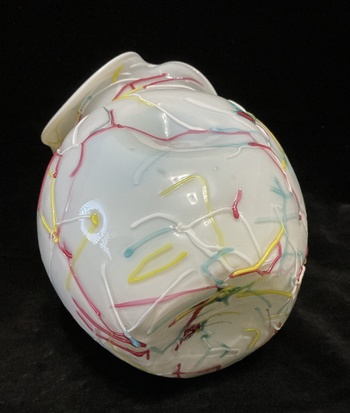 It is made from two layers of cased glass, clear over white, with applied Peloton threads in white, pink, blue & yellow. The vase measures 16 cm tall, 12 cm across the three - way crimped top rim, & 7.5 cm across the base, which has a neatly polished out pontil mark. It also features three indentations on the sides. It is the girth of around 44 cm that really makes this a big unit for Peloton glass. The shape is also one I haven’t encountered before. All in all, a most desirable piece!