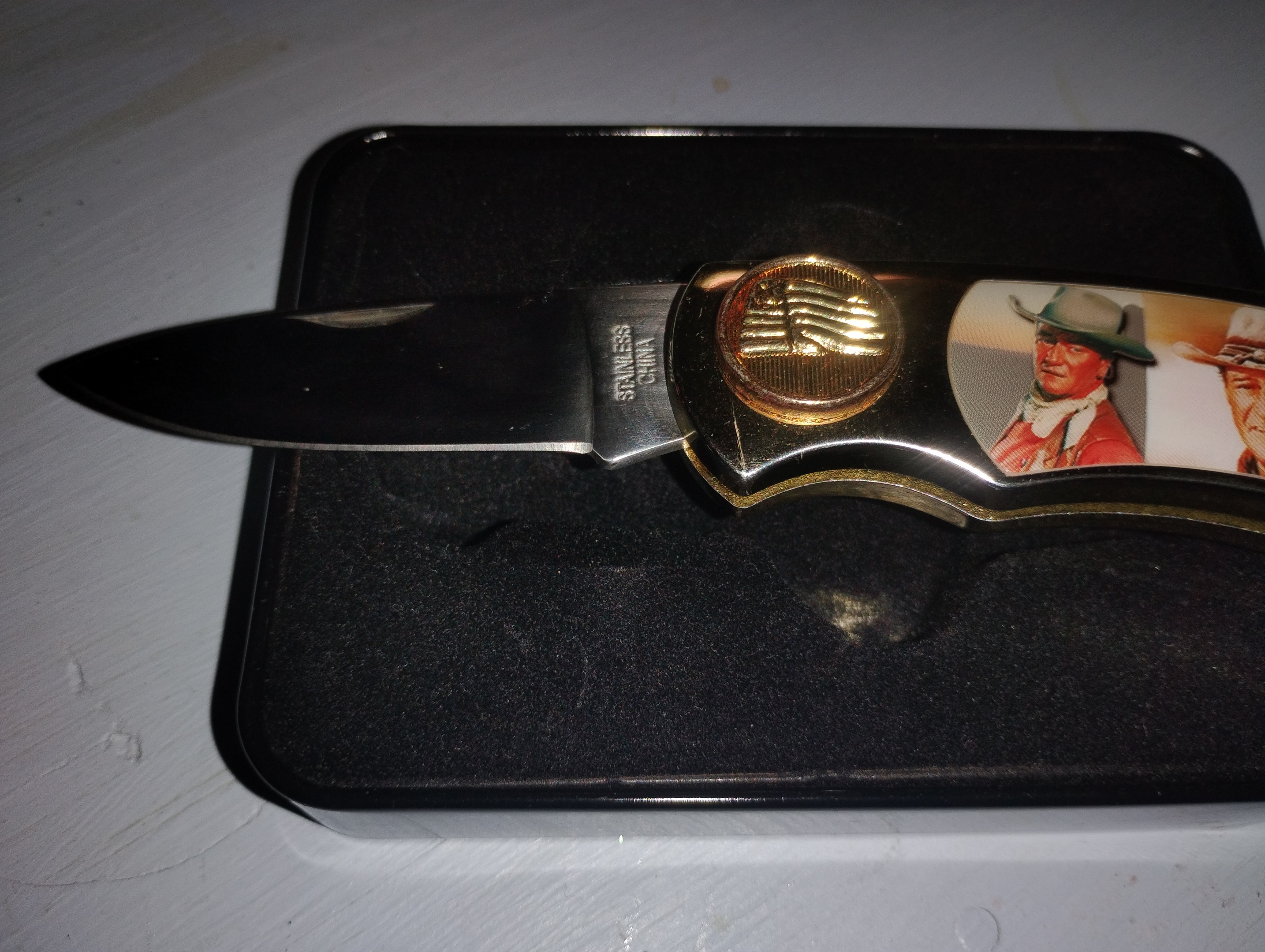 Just A Simple Drop Point Blade Pocket Knife Done In Commemorative Tribute To The Late Actor John Wayne.