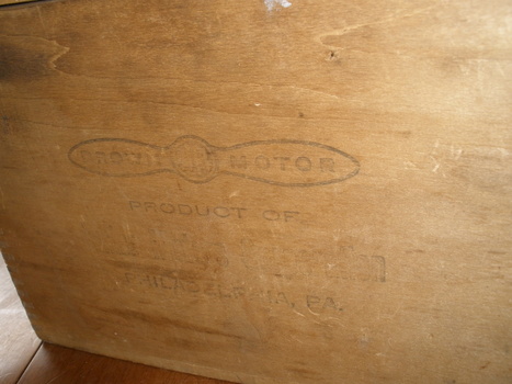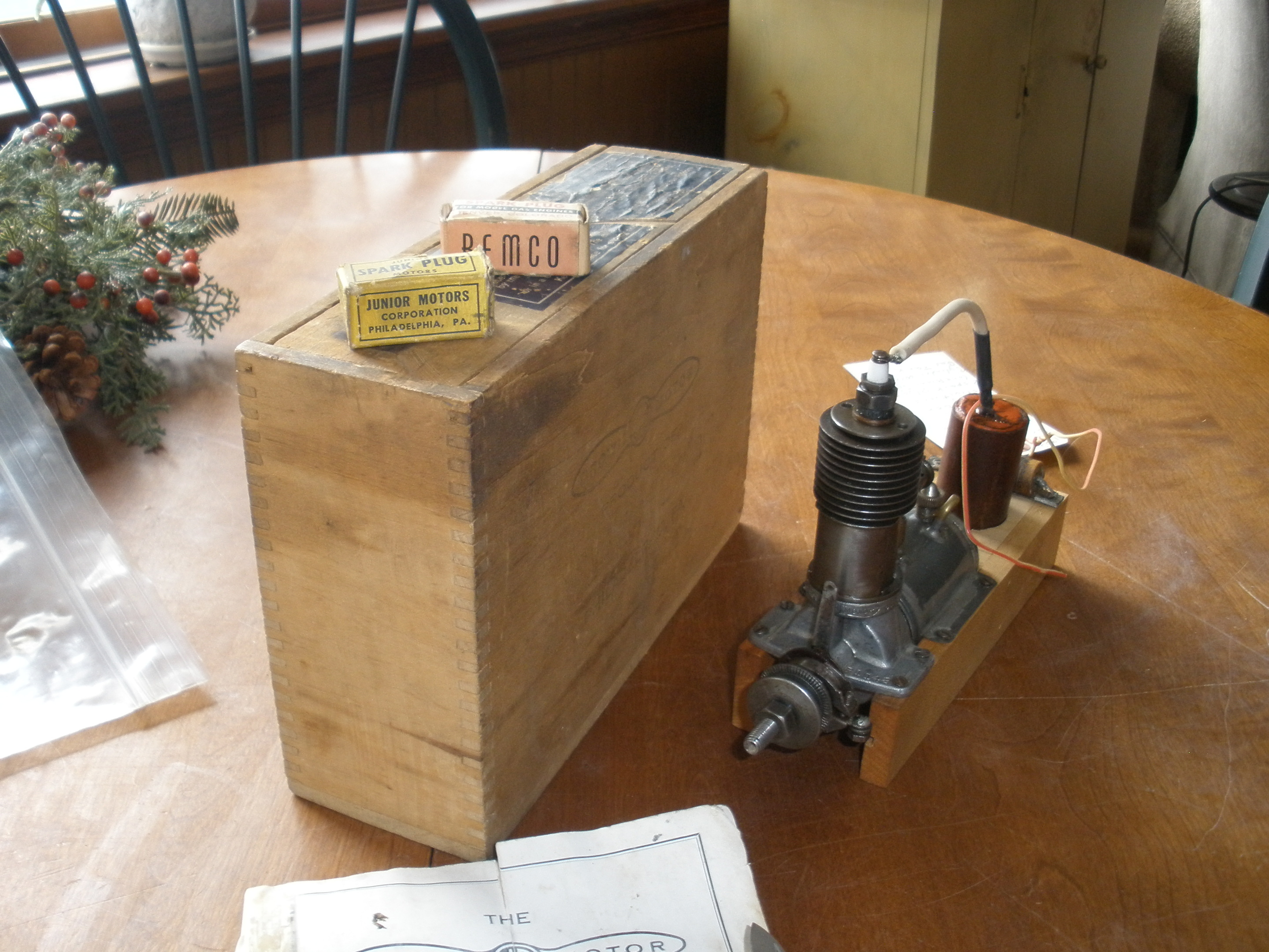 This isa model airplane gasoline engine from 1935. Its name is the Brown Jr. from the Brown Junior Motor Co., Phila. PA. It is one of the earliest model engines of the time that was built in the USA. It is mounted on the shipping platform and in the original dovetailed wooden box. It is complete with two extra sparkplugs (one is a Brown Jr. plug), a wrench for cylinder. removal, instructional book, capacitor, a battery, and a fuel tank. This engine was never fired up and is in like new condition.