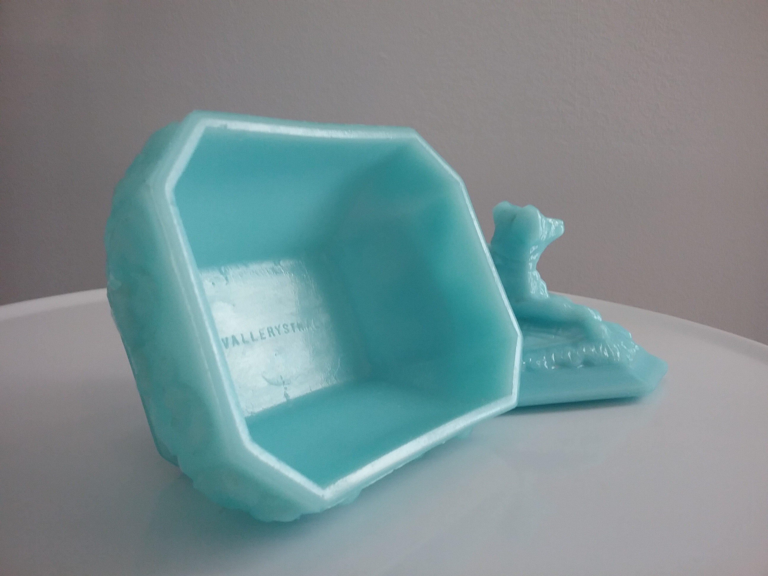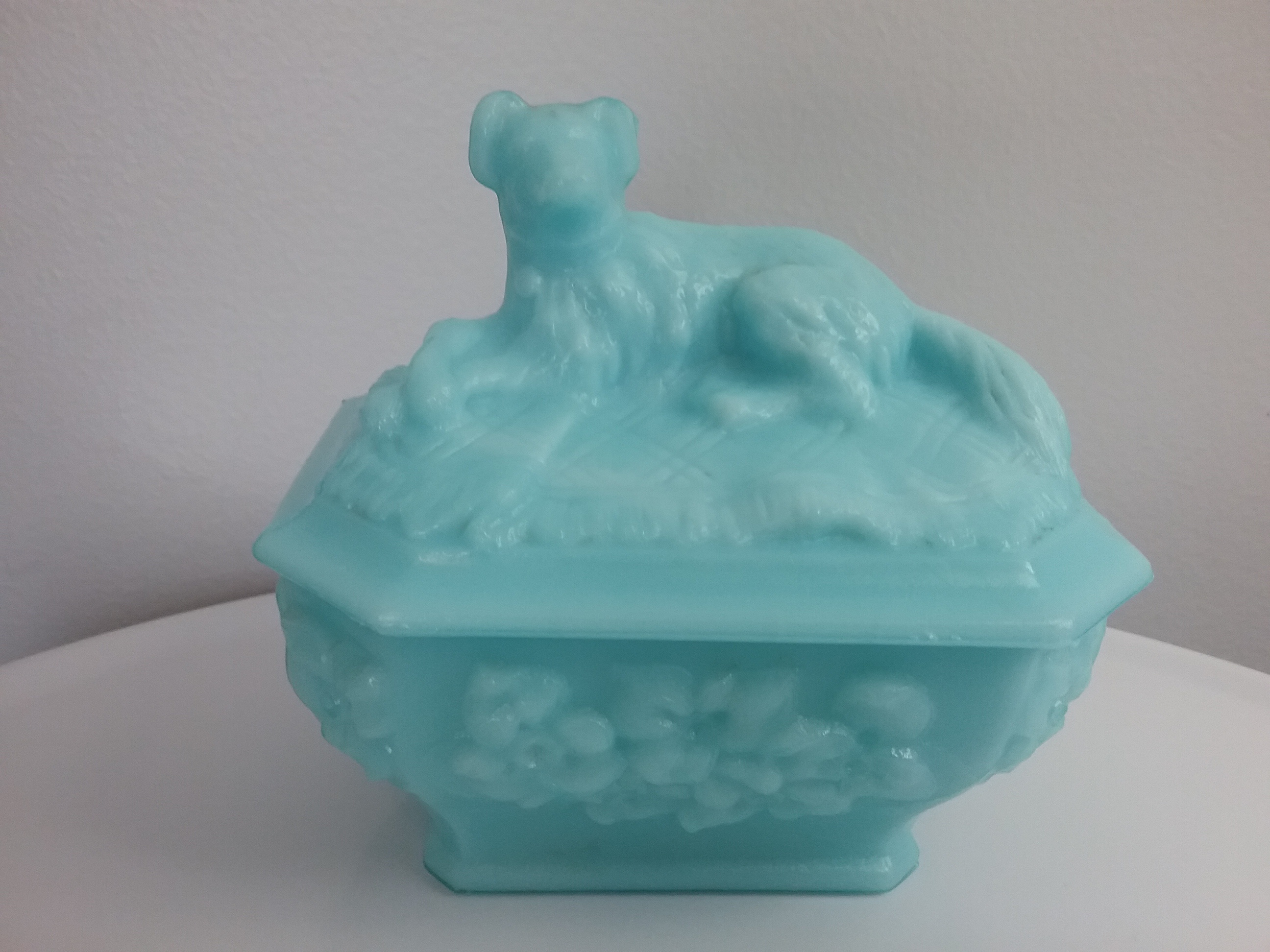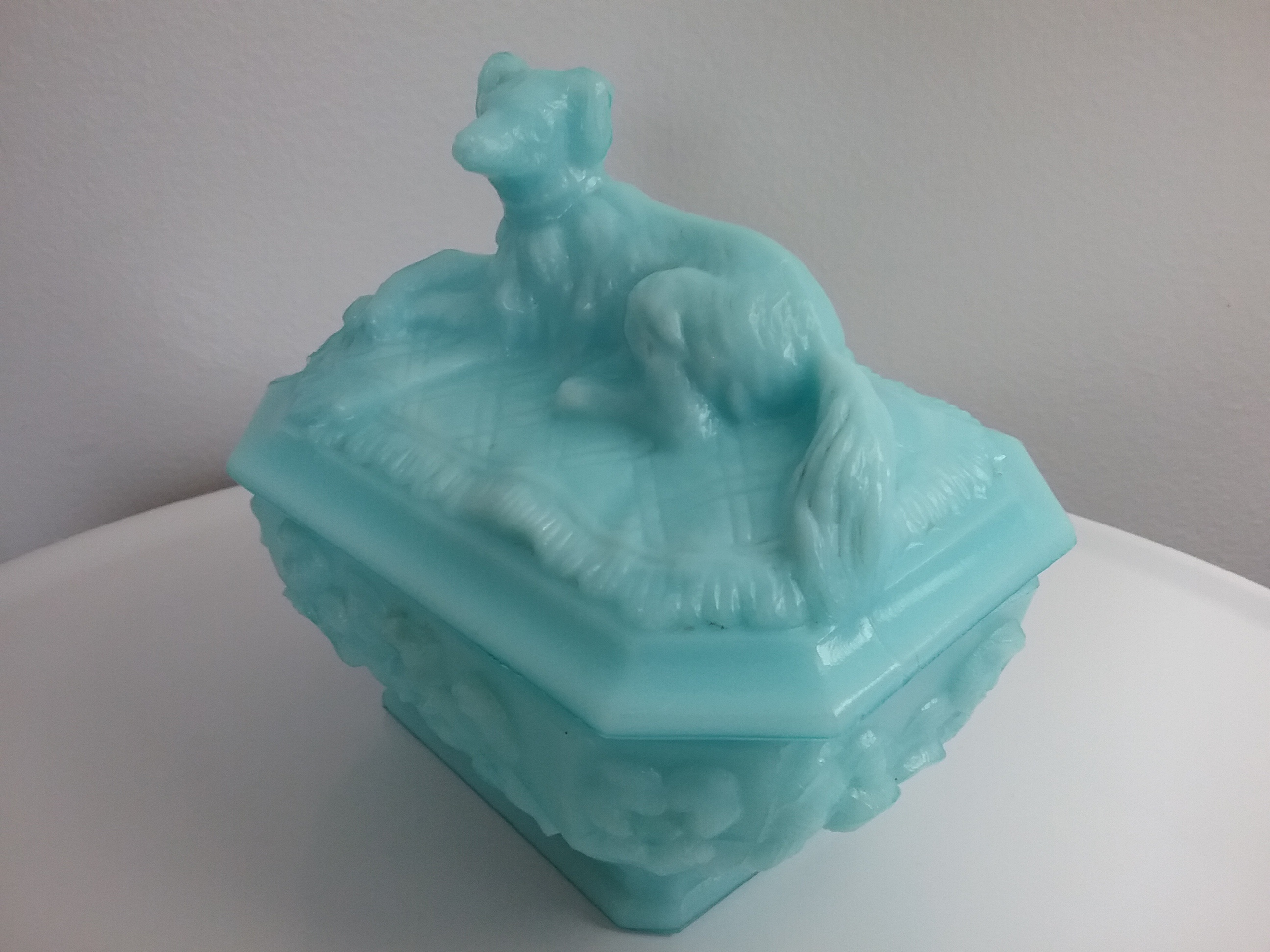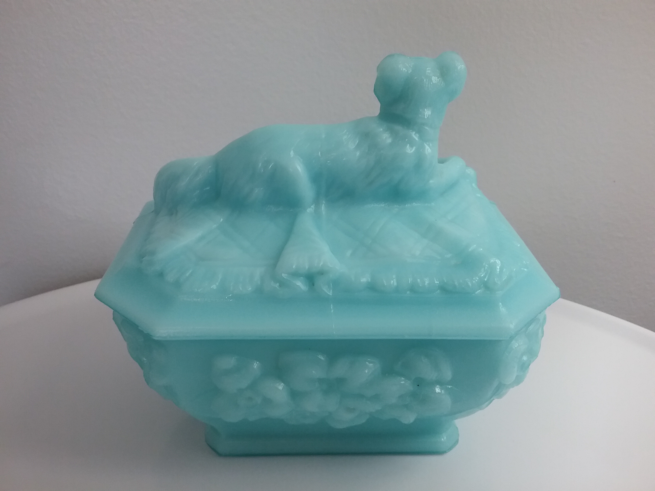 Here is a 5 x 5" blue opaline glass floral dish with lid of a hunting dog sitting on a fringed crisscross pattern blanket. Made by Portieux Vallerysthal of Lorraine France, with 'Vallerysthal ' imprinted inside dish. Design ca the 1930s