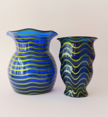 Kein Schnitt bekannt. Form und Dekor 1920, dunkelblau mit Goldfäden Ausführung 178. Auf dunkelblauem Unterfang farblose Deckschicht, mit grün und metallischem Silbergrau breit umsponnen, im sechsteiligen Rippenmodel zu Wellen verformt, dann farblos überfangen. Modelgeblasen und geformt. H. 18,5 cm