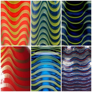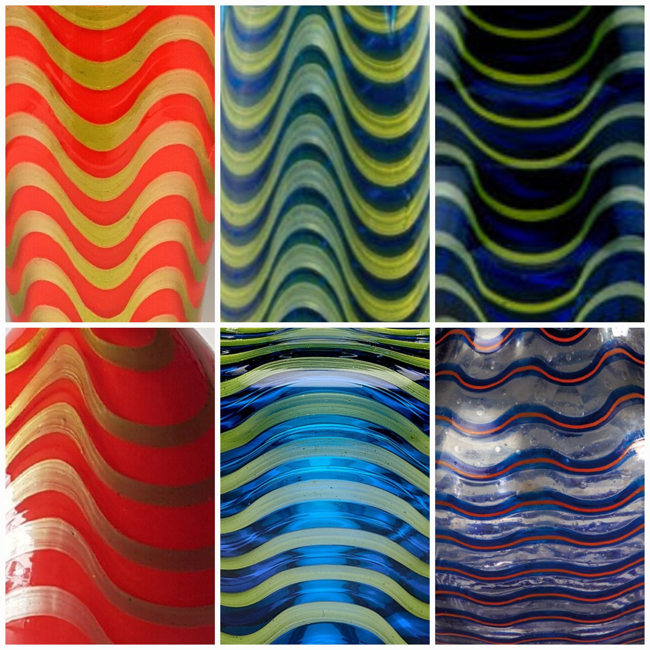 Auf dem letzten Bild der Collage können Sie anhand eines anderen noch nicht identifizierten Lötz-Dekors besser erkennen, wie die beiden Farben des aufgesponnenen Fadens übereinanderliegen.