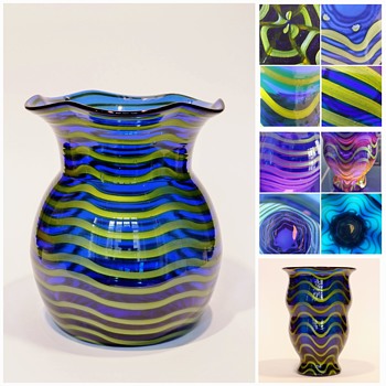 Form und Dekor 1920, PN III 1160, dunkelblau mit Goldfäden Ausführung 178. Auf dunkelblauem Unterfang farblose Deckschicht, mit grün und metallischem Silbergrau breit umsponnen, im Sechsteiligen Rippenmodel zu Wellen verformt, dann farblos überfangen. Modelgeblasen und geformt. H. 16,5 cm