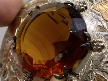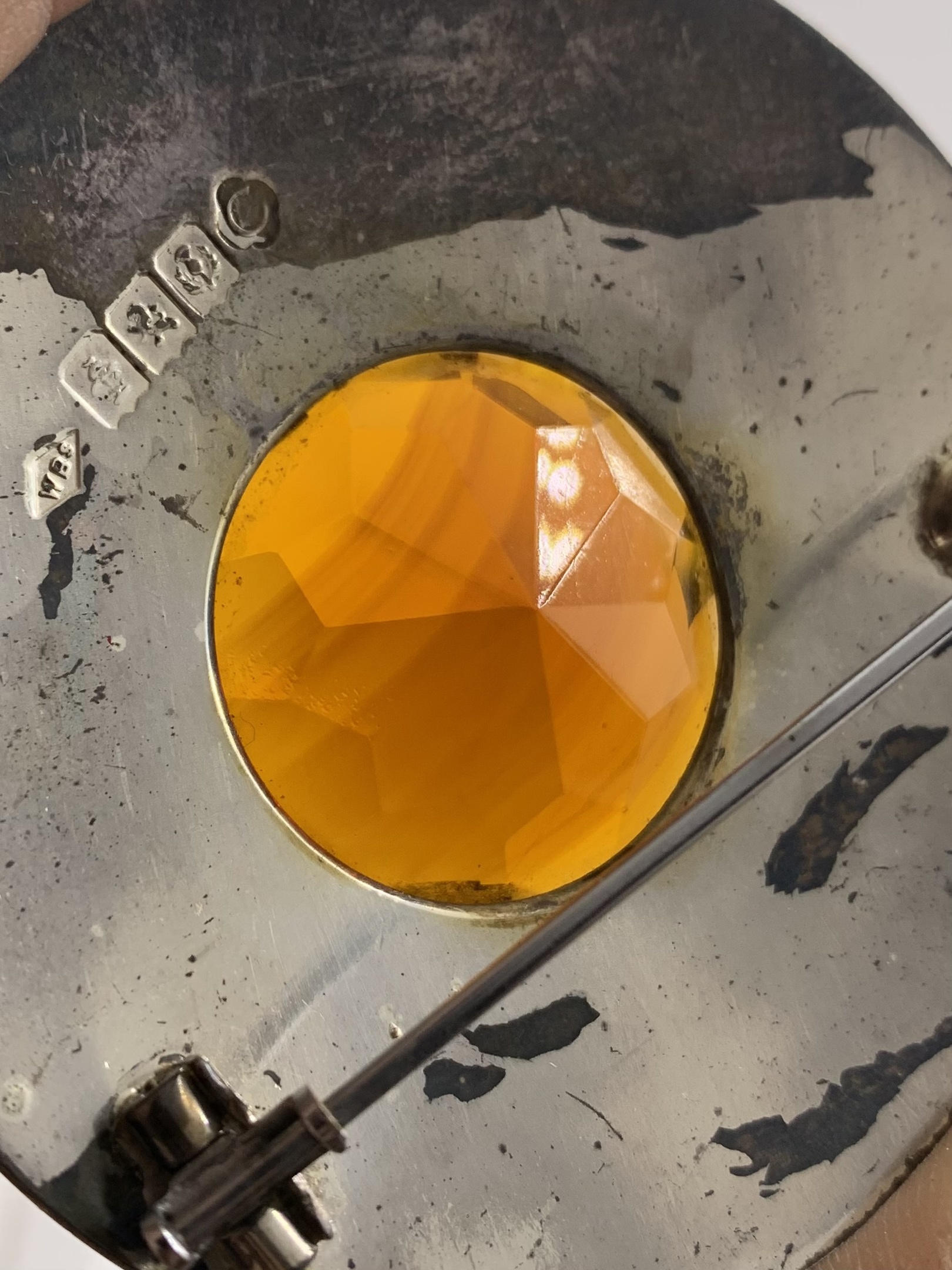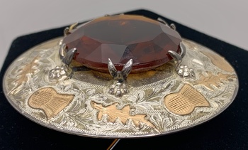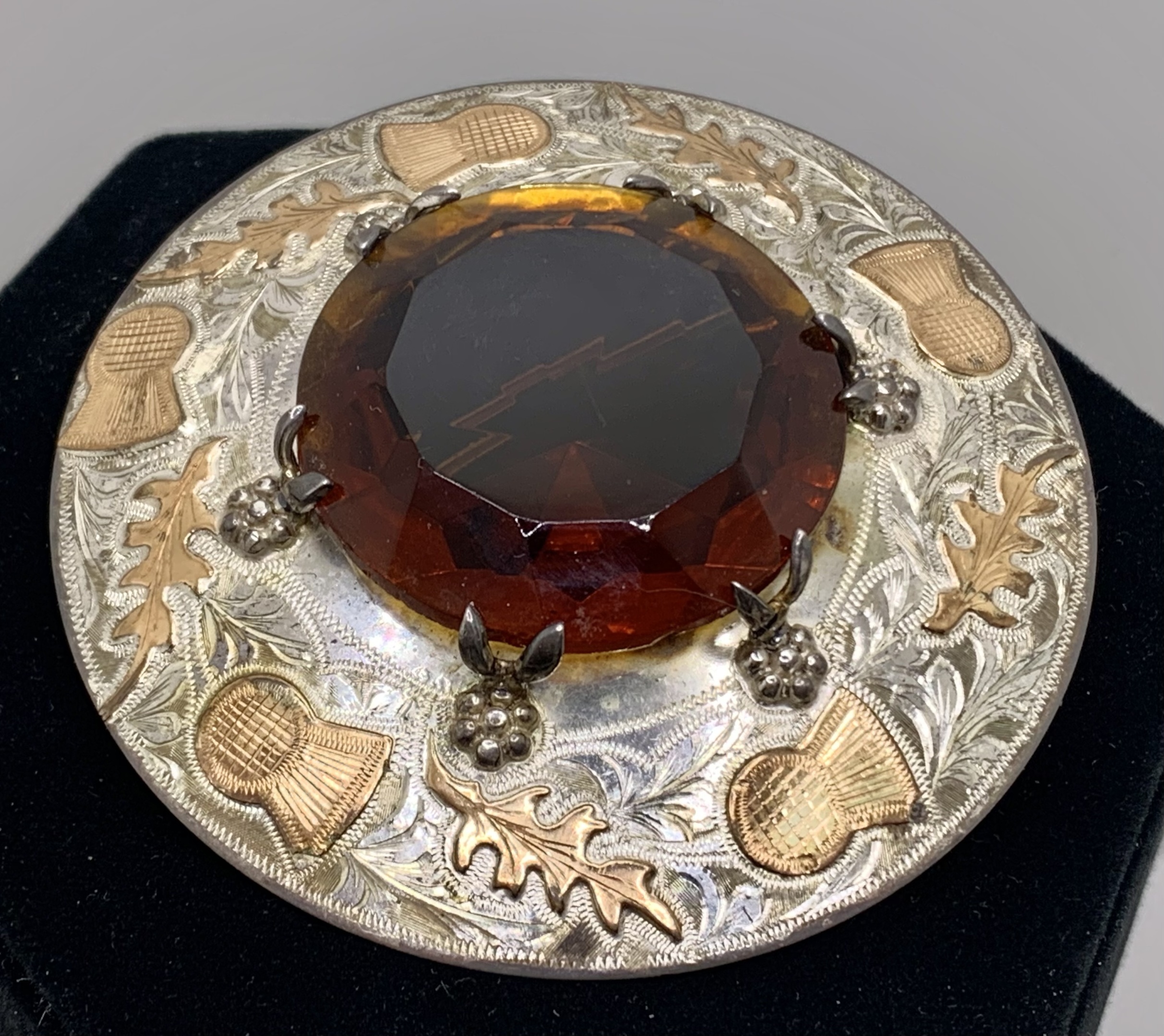 Made by the Ward Brothers out of Glasgow during the Mid century. A wonderfully overly large sterling brooch with gold overlay thistle designs. The large faceted Cairngorm gemstone mounted in the center is a respectable 34.8mm is diameter and 14.5mm height cognac colored. A veil or feather like inclusion inside and visible with back lit views. The brooch is 3” in diameter, weighs 50.8g, and has Glasgow hallmarks.
