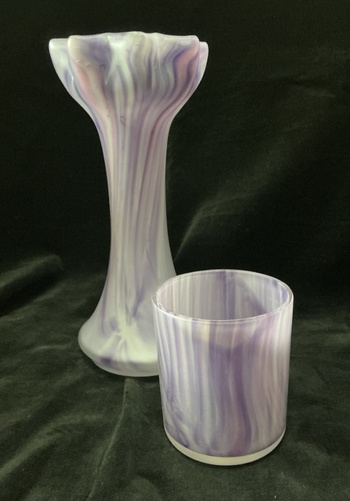 As can be seen in the last photo, the distinctive mauve & pink streaked decor matches another item in my collection. This has an iridescent finish instead of satin, but I do feel they are both most likely by the same maker.