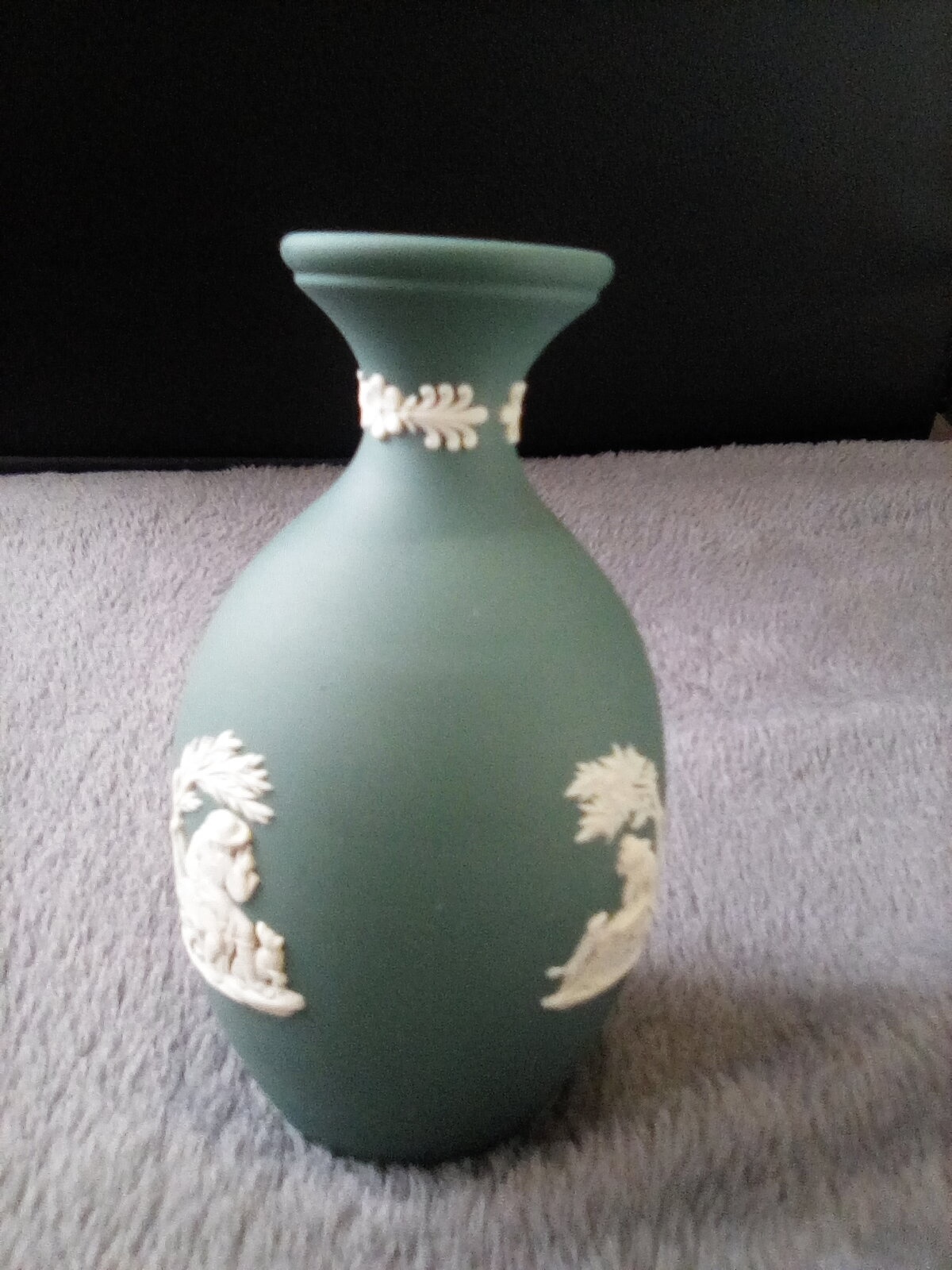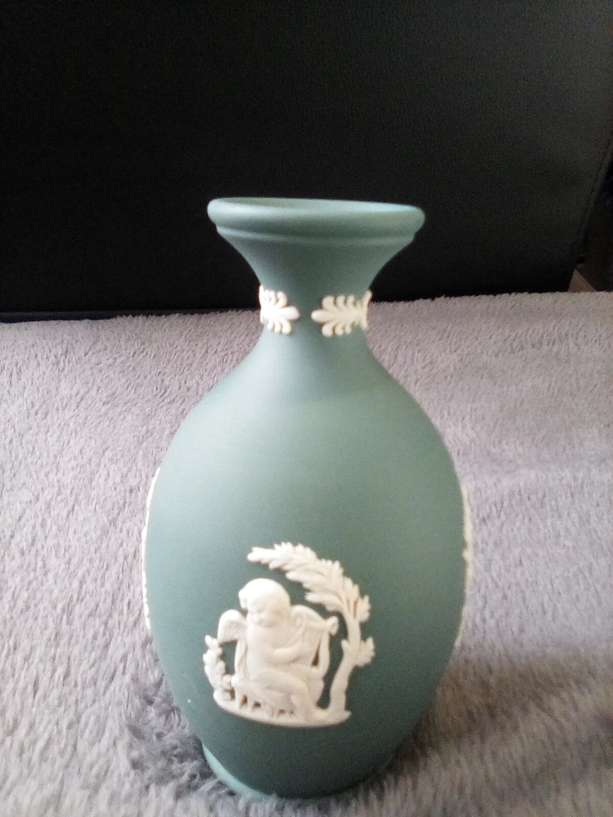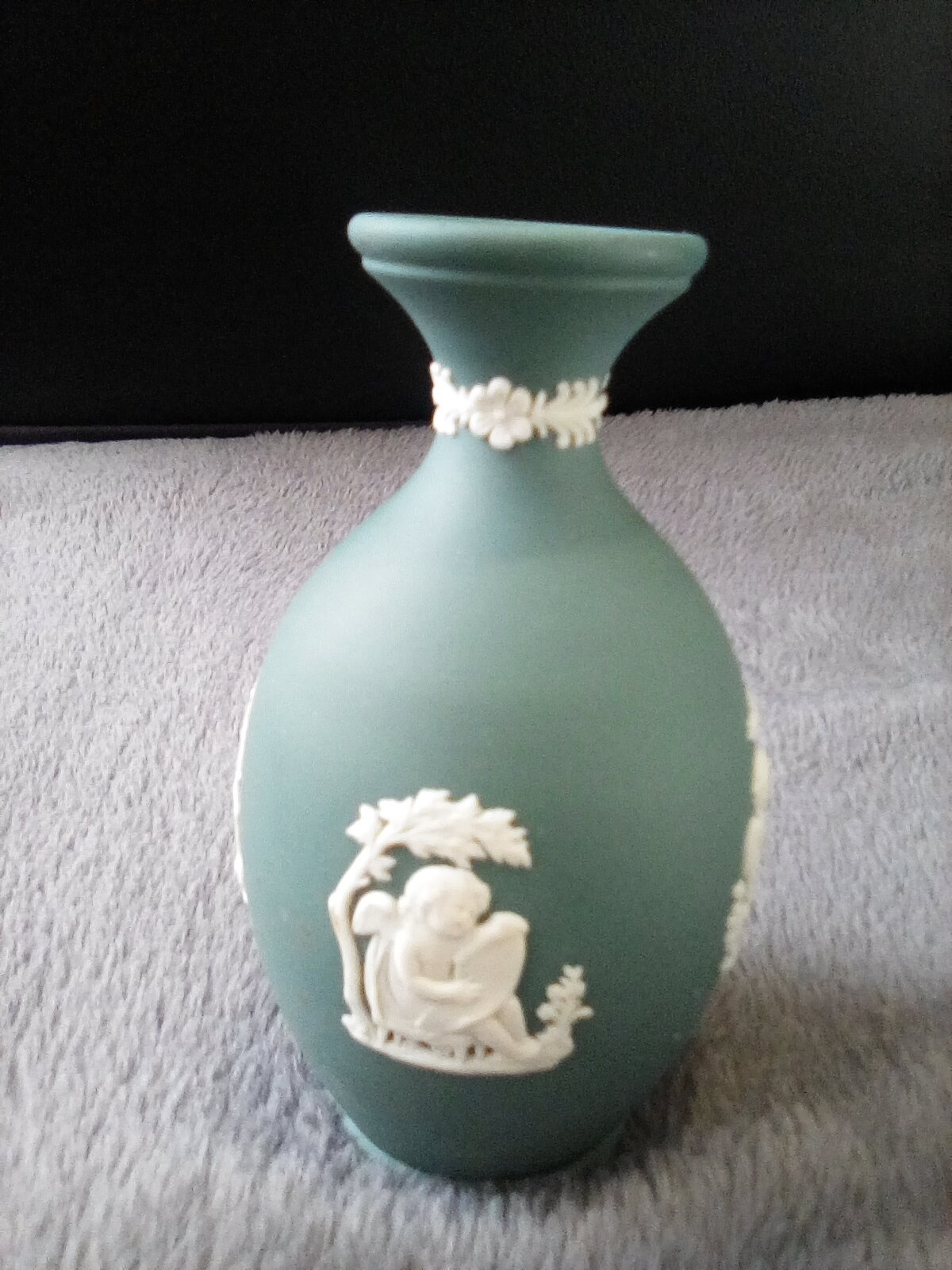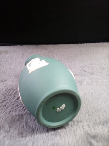 Building my Wedgwood teal or spruce jasperware colection, this bud vase has cherub babies on 4 sides, printed Wedgwood made in England below