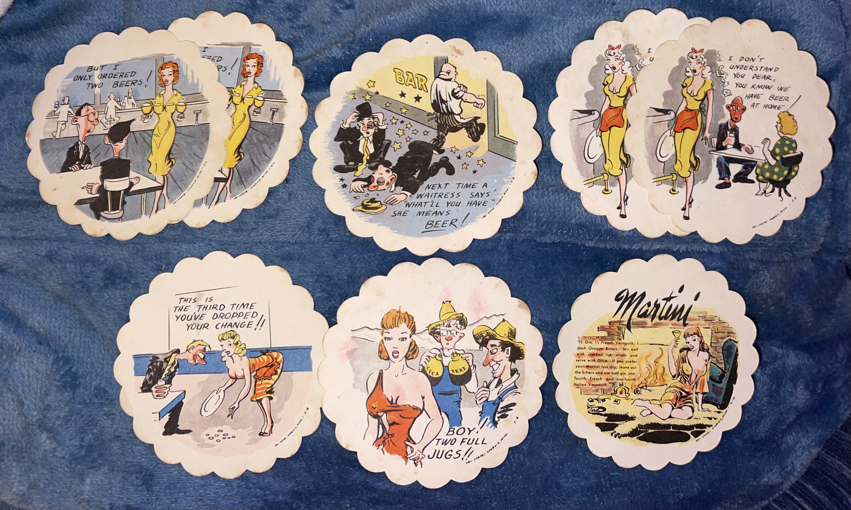Vintage, funny, naughty/risque, paper coasters that are circular with scalloped edges that say, “TRI STATE•STURGIS, MICH” followed by numbers.
