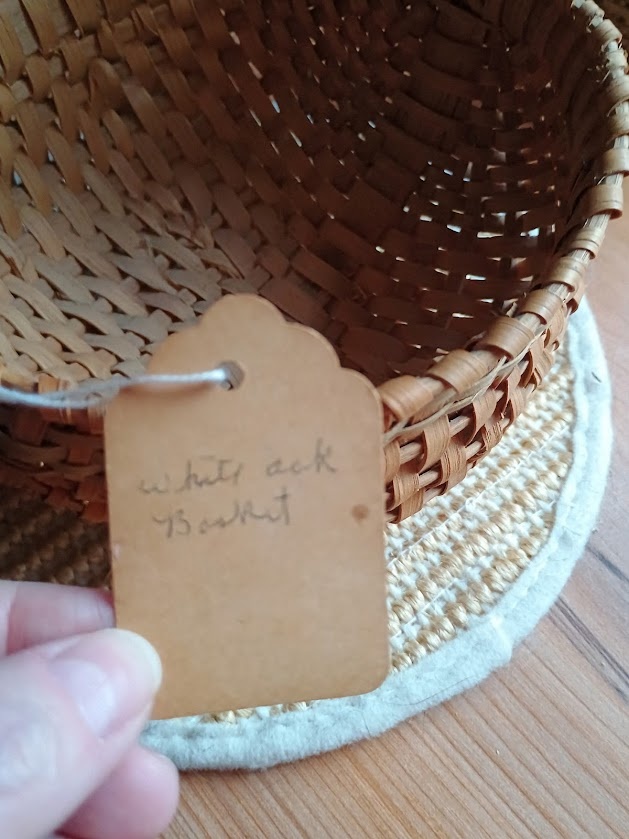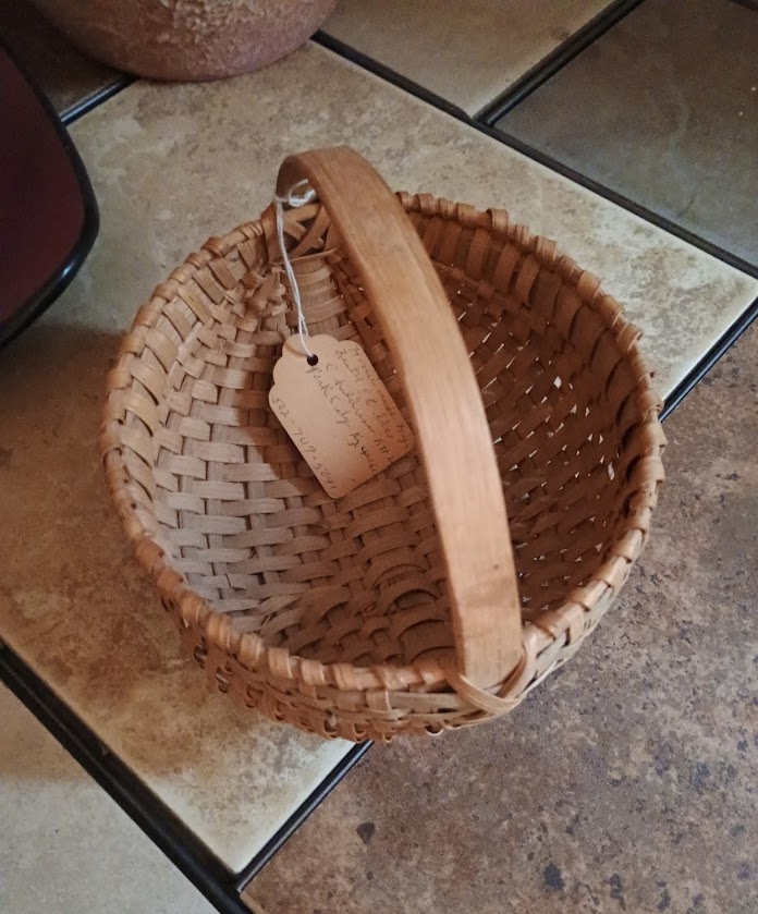 White Oak Egg Basket, made by Lestel and Ollie Childress, 1970s. They were married in 1945, the same day Lestel enlisted in the Army during World War II. He had just turned 18, and Ollie was 15; they had known each other for years prior. Measures 6 inches in length and width, and a total of 6 inches from the bottom to the top of the handle. It is made of White Oak splints, with the handle fashioned from a thick slice of Oak. The tag on the basket has yellowed with age and shows both of the Childress's names, address, and phone number. The other side says "White Oak Basket". This was a valuable find; these baskets don't come up very often in the market.