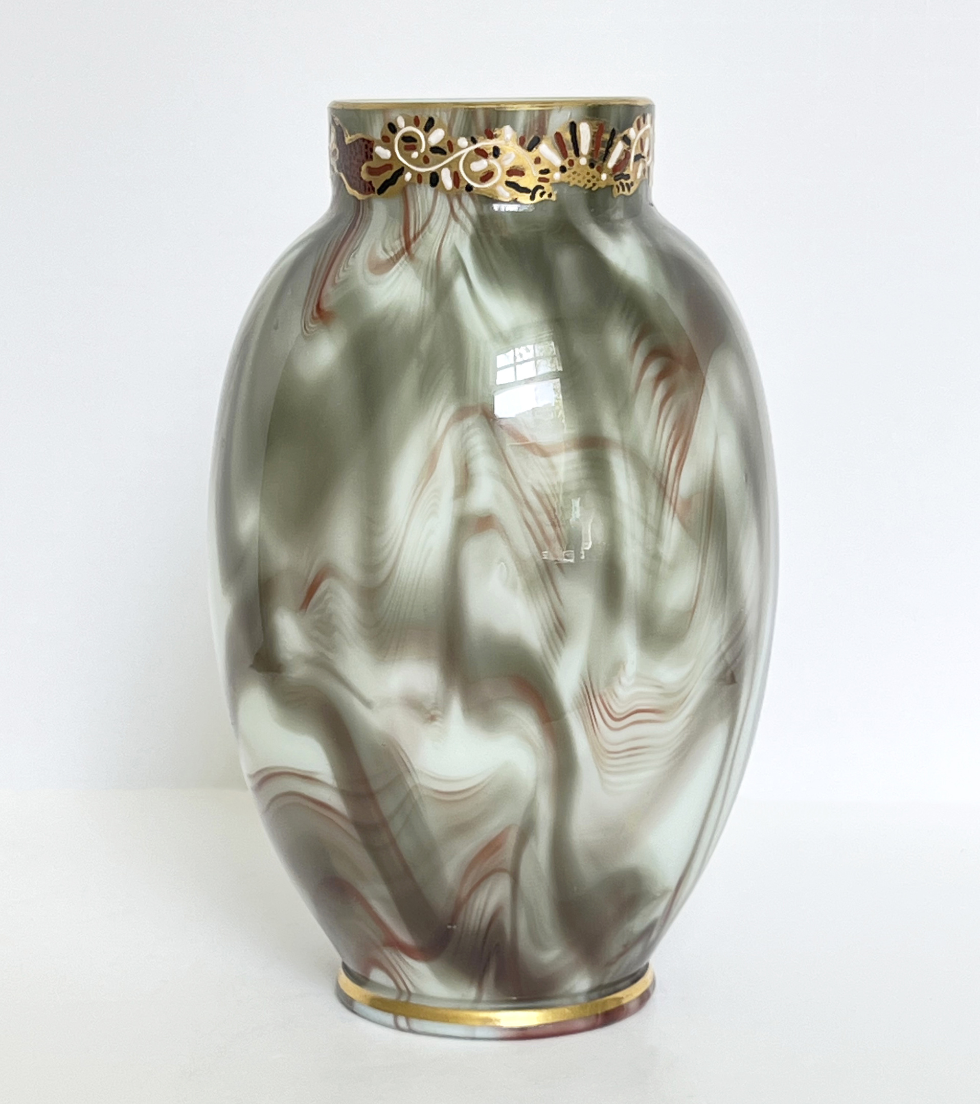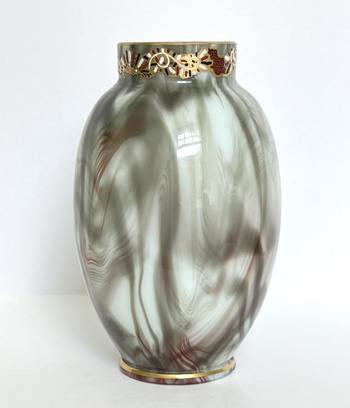 This vase is in amazingly good condition for dating to about 1888; it is Loetz's 'hellmarmor' decor, which means 'pale marble'. In comparison to others of the Loetz marmoriertes decors (those that look like marbled stone), hellmarmor is very soft and delicate in color, and one of my favorites. The enamel decoration (DEK still unknown) around the collar of this vase is in excellent condition, too. The vase measures 7" (17.8cm) inches tall.