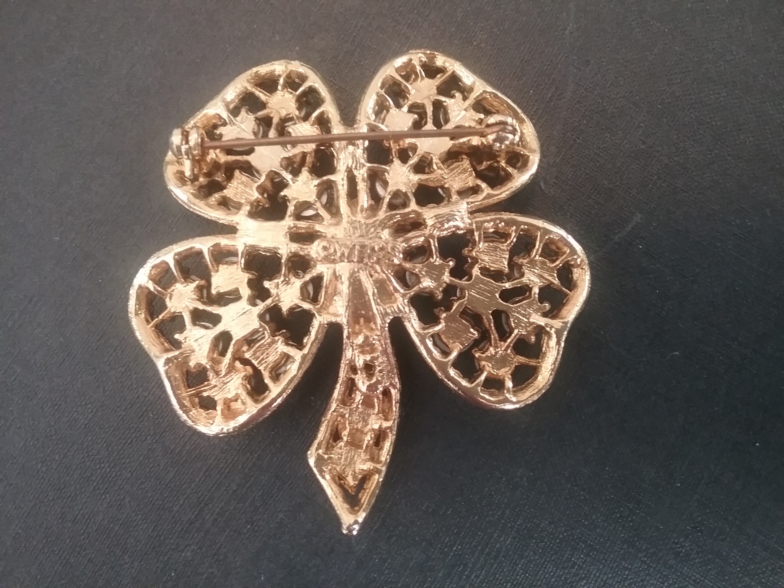 This 2" four leaf clover brooch has round yellow rhinestones in an antiqued goldtone setting. By Weiss ca the 1960s with mark on the back
