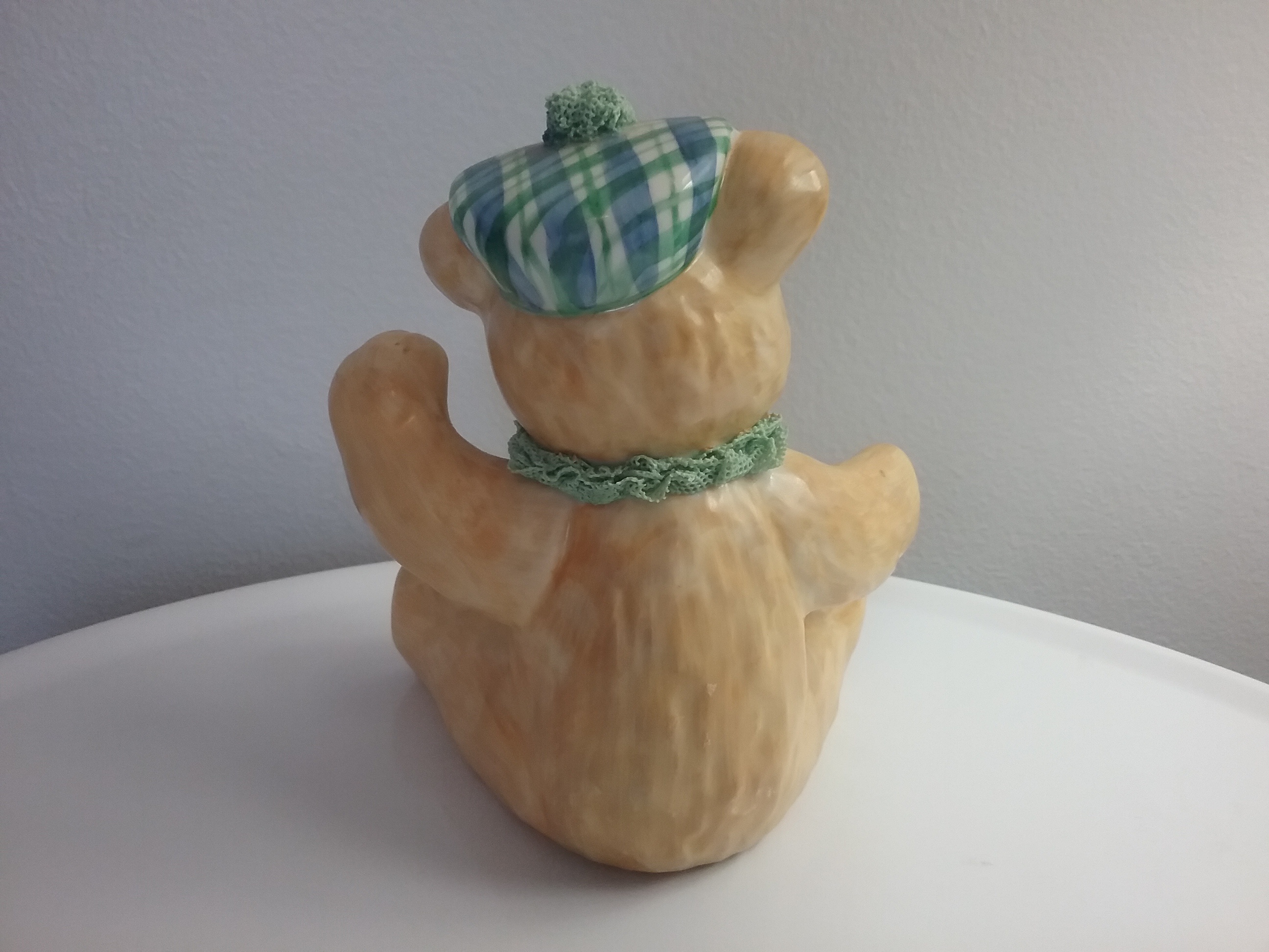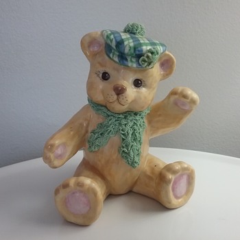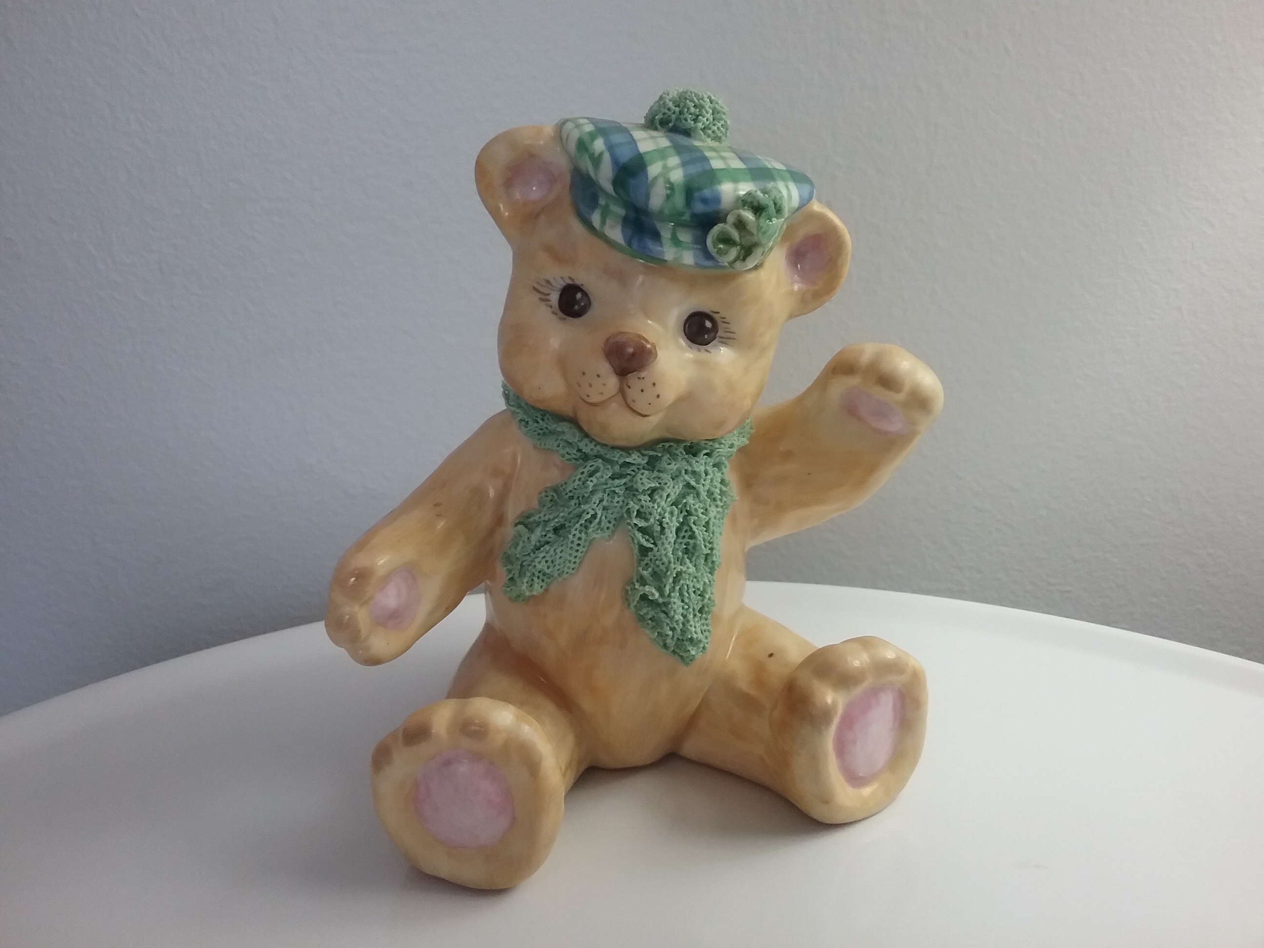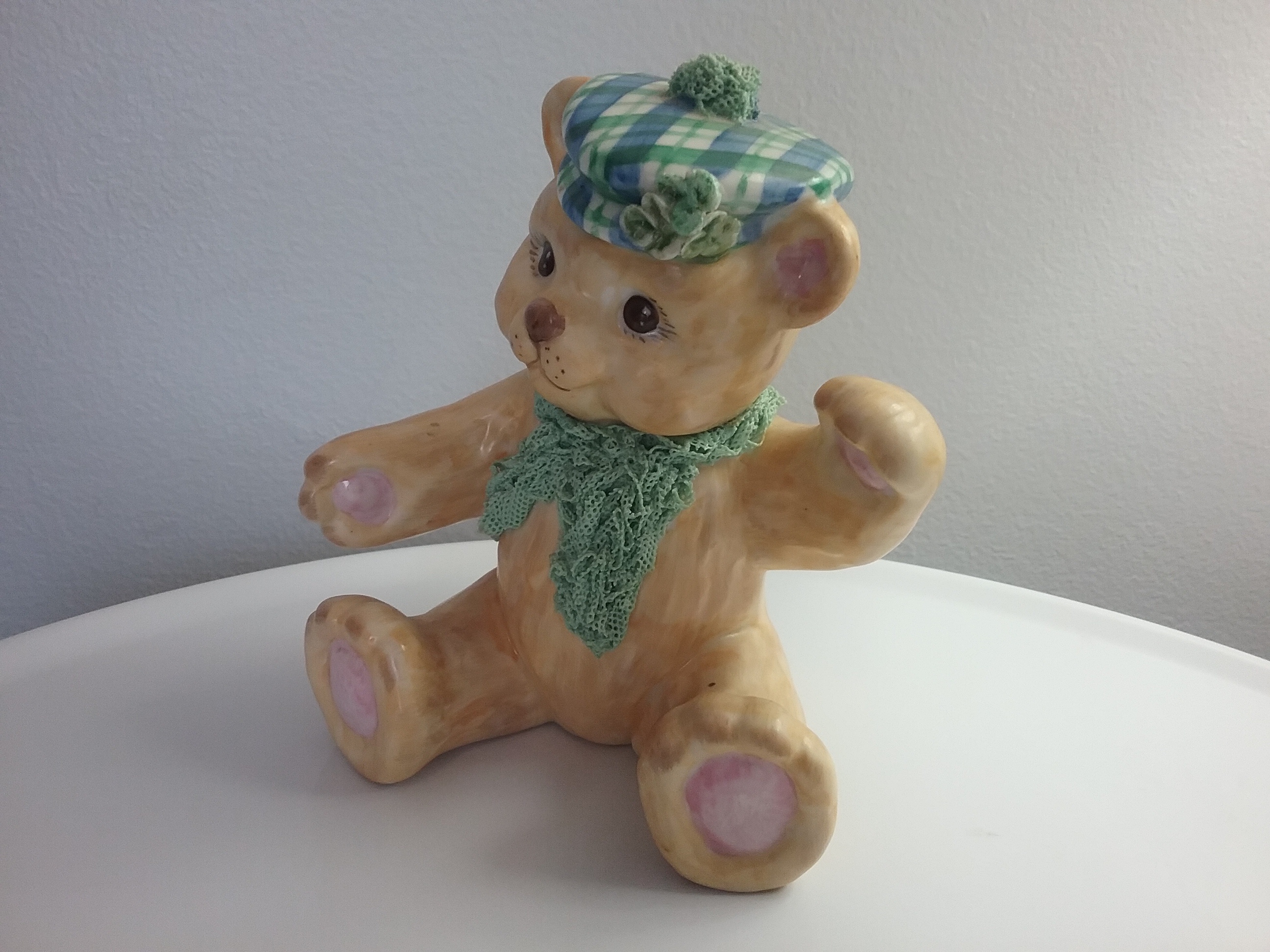 Here is a 5 1-4"H hand painted beige porcelain teddy bear with plaid cap and 'spaghetti lace' scarf & cap top, named the St Patrick's Day Bear, Ireland on bottom. The MV Irish Dresden crown mark indicates German porcelain maker Muller Volkstedt, who opened the co in Ireland in 1962
