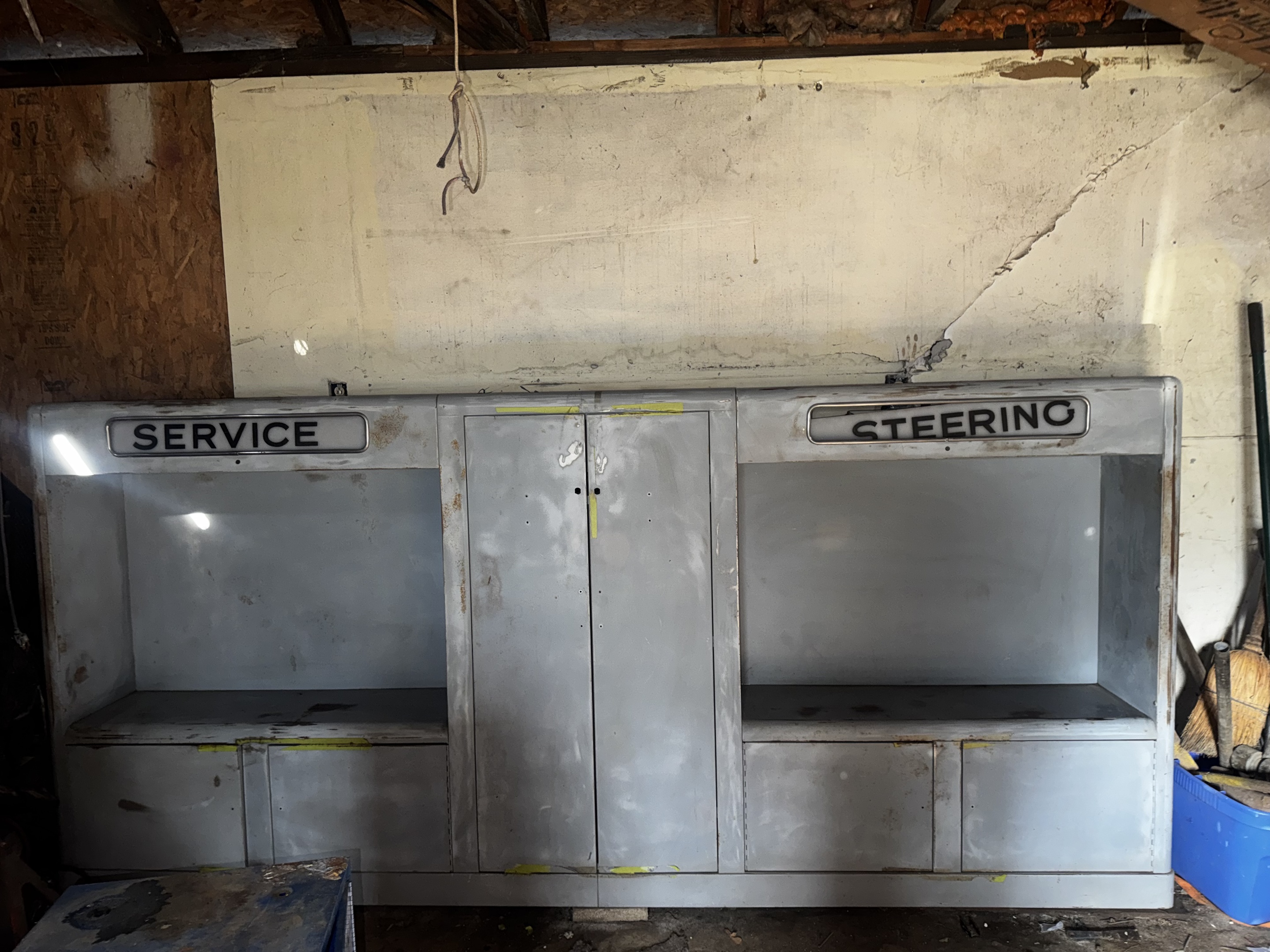 This is a large JOHN BEAN service cabinet that originally came from a Pontiac dealership service department. It has been part of our family shop history for decades. We’ve had it in our body shop for over 20 years, and before that it belonged to my husband John’s father and was in his shop another 15–20 years.