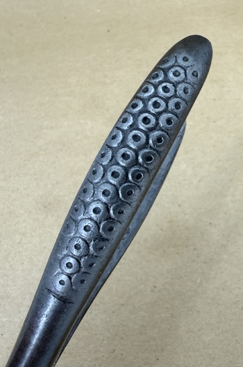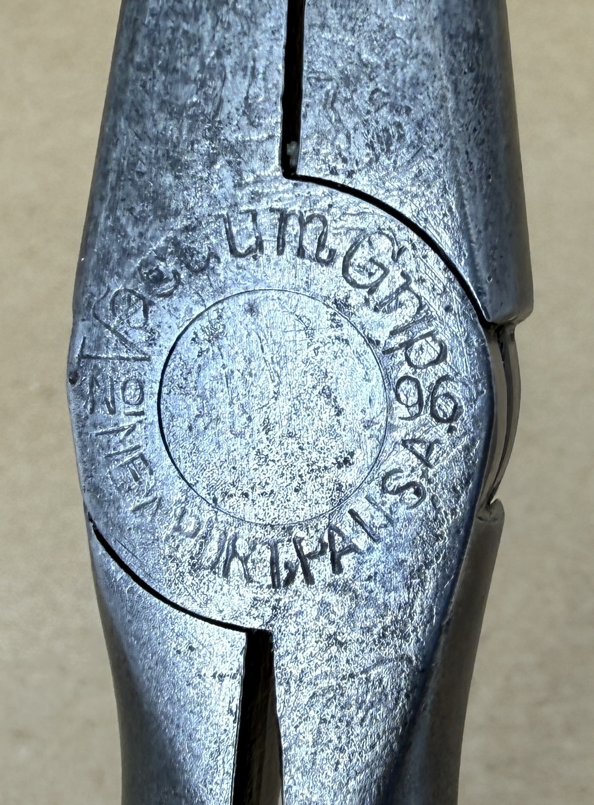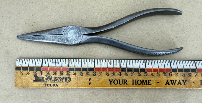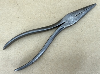 A late-1920s set of Forged Steel Products Vacuum Grip No. 96 needle nose pliers. Around the pivot it’s stamped over the top with the “Vacuum Grip” logo; “No.” and “96” in the center on either side of the pivot, and “Newport, PA. U.S.A.” around the bottom. The No. 96 needle nose pliers was first introduced in 1926, and these are early pliers as there are no date markings stamped on the underside of either handle. The handle pattern giving rise to the name "vacuum grip," design patent #D57,252, was issued to in 1921. In 1945, Snap-On acquired Forged Steel Products.