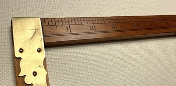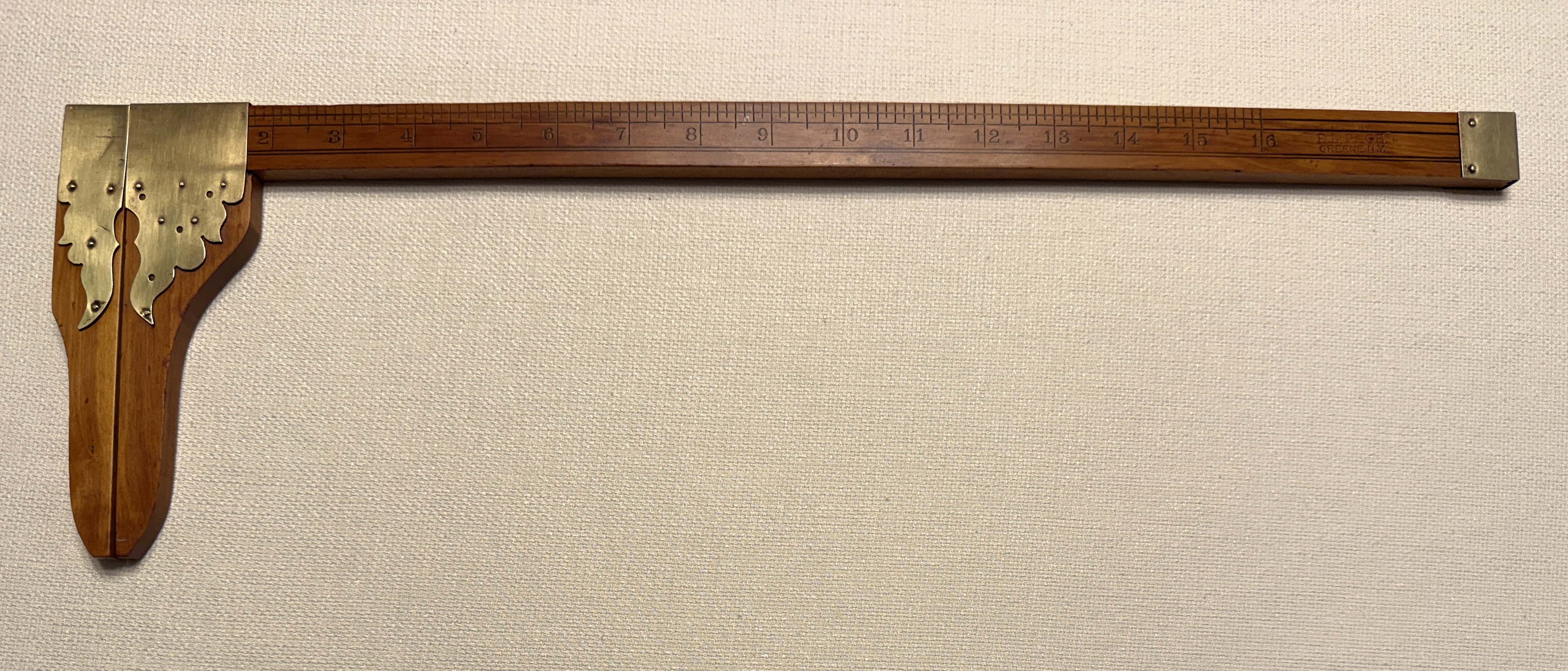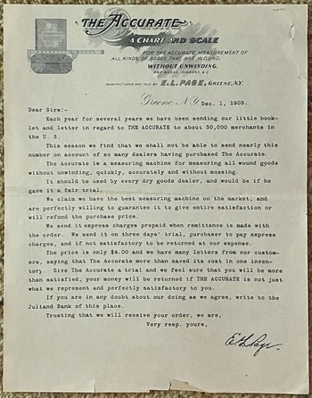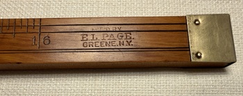 This is the ca. 1889 to 1903 E.L. Page Mfg. 16” Boxwood rule, called “The Accurate.” It was created and manufactured by Erford L. (E.L.) Page, of Greene, NY, as a “measuring machine for measuring all wound goods without unwinding, quickly, accurately and without mussing [to be] used by every dry good dealer … if he gave it a fair trial.” Based on the limited records I have located, from as early as 1889 to as late as 1903, Mr. Page sold The Accurate for $4.00, which is equivalent, in 2026 purchasing power, to about $147.84.