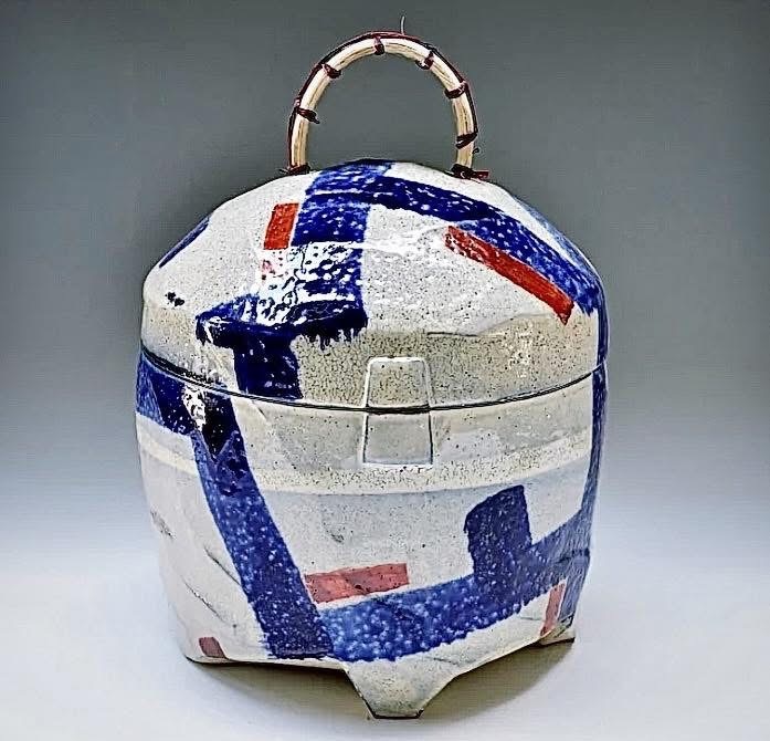 Stoneware lidded jar with cobalt blue brushed lines, crackle slip, oxidation fired cone 9 with a clear glaze, red enamel fired on. Rattan handle with wax linen thread. 10 x 7.5 x 7.5?, 2025