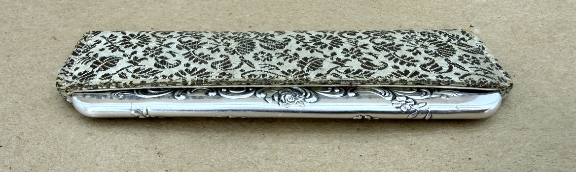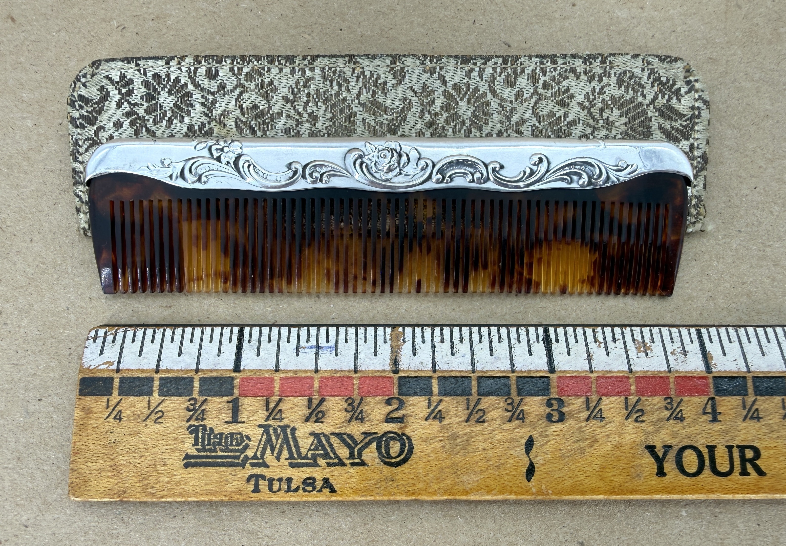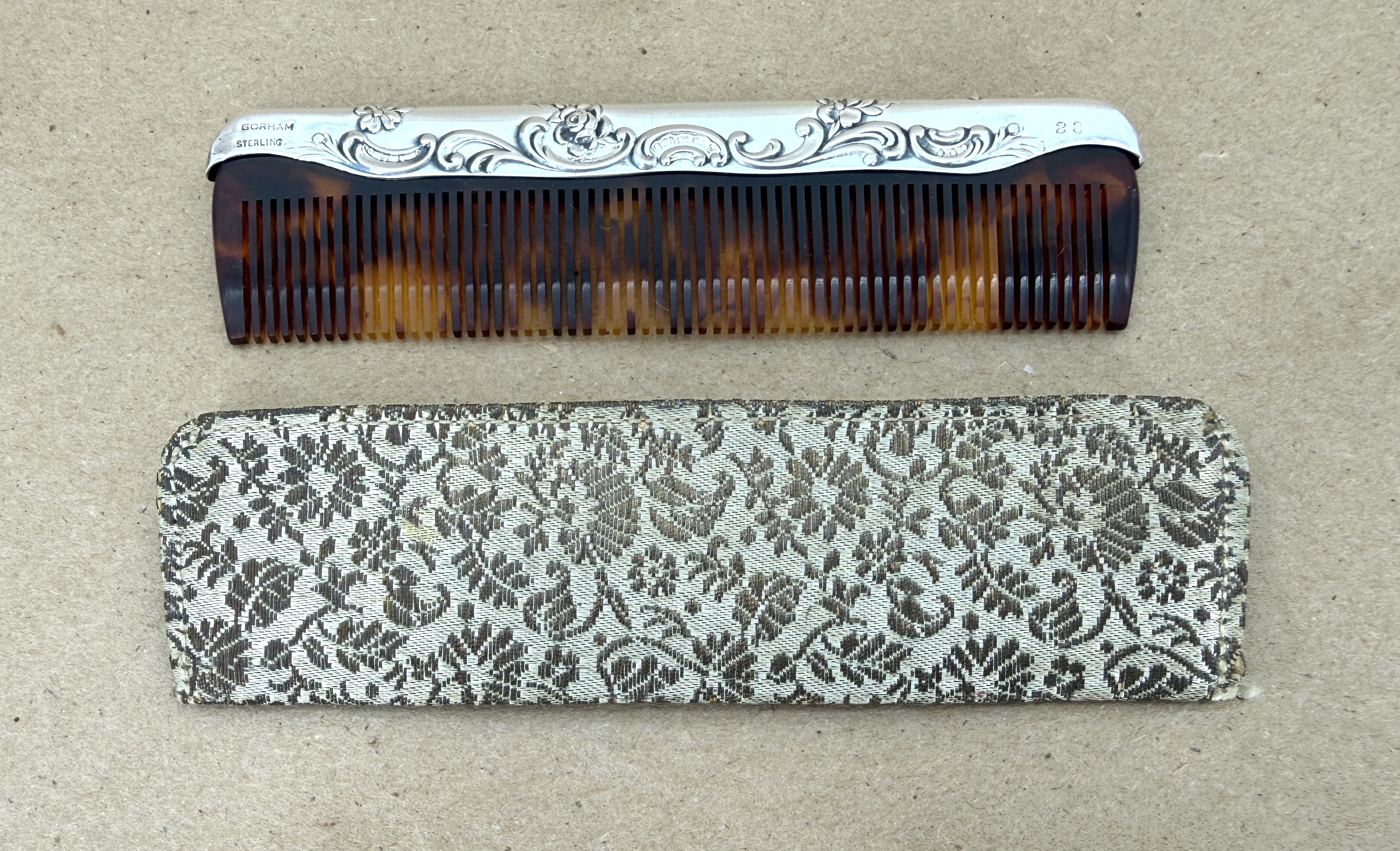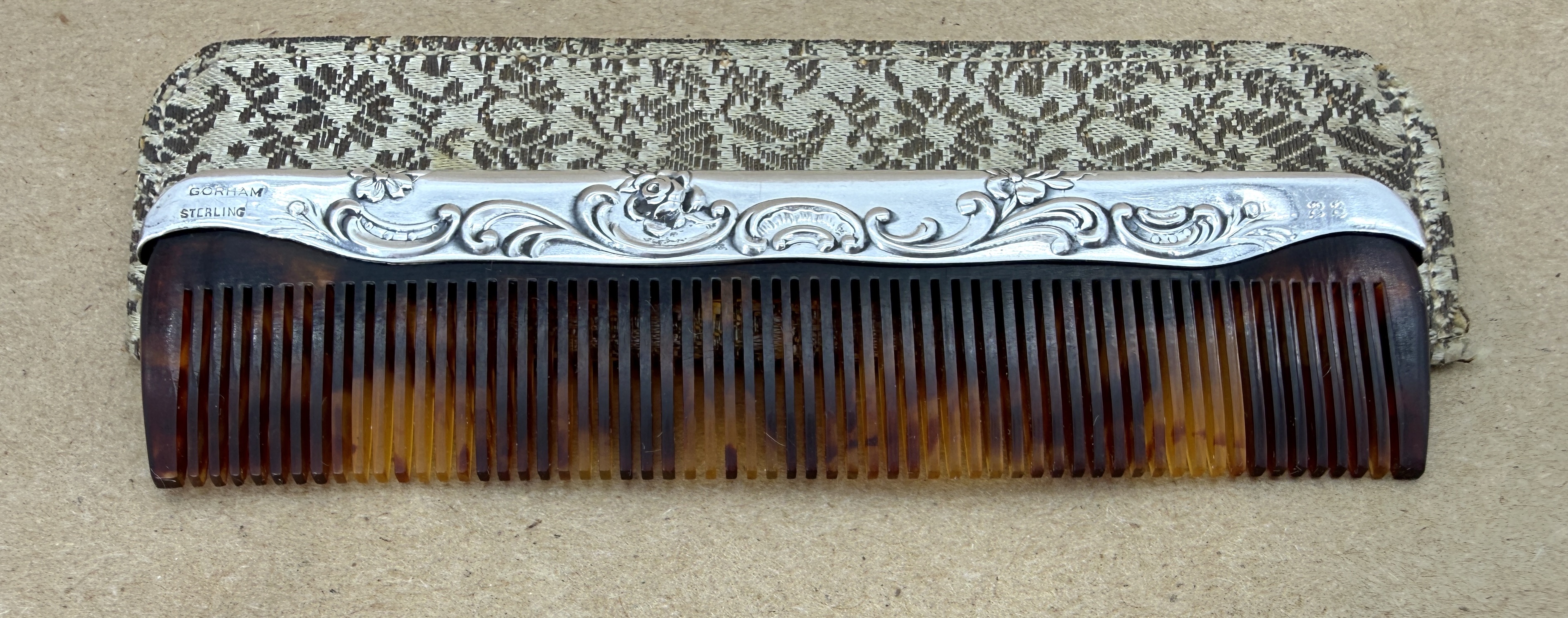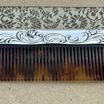 Comb is 4 inches in length, with markings reflecting it is made by Gorham of sterling silver, and it's their "23" comb. Comb material appears to be tortoise shell in style - either plastic or genuine turtle. I'm not sure. The sheath was with the comb and it fits well, but I am not completely certain that it is original with the comb. Any info or guidance you may have is appreciated.