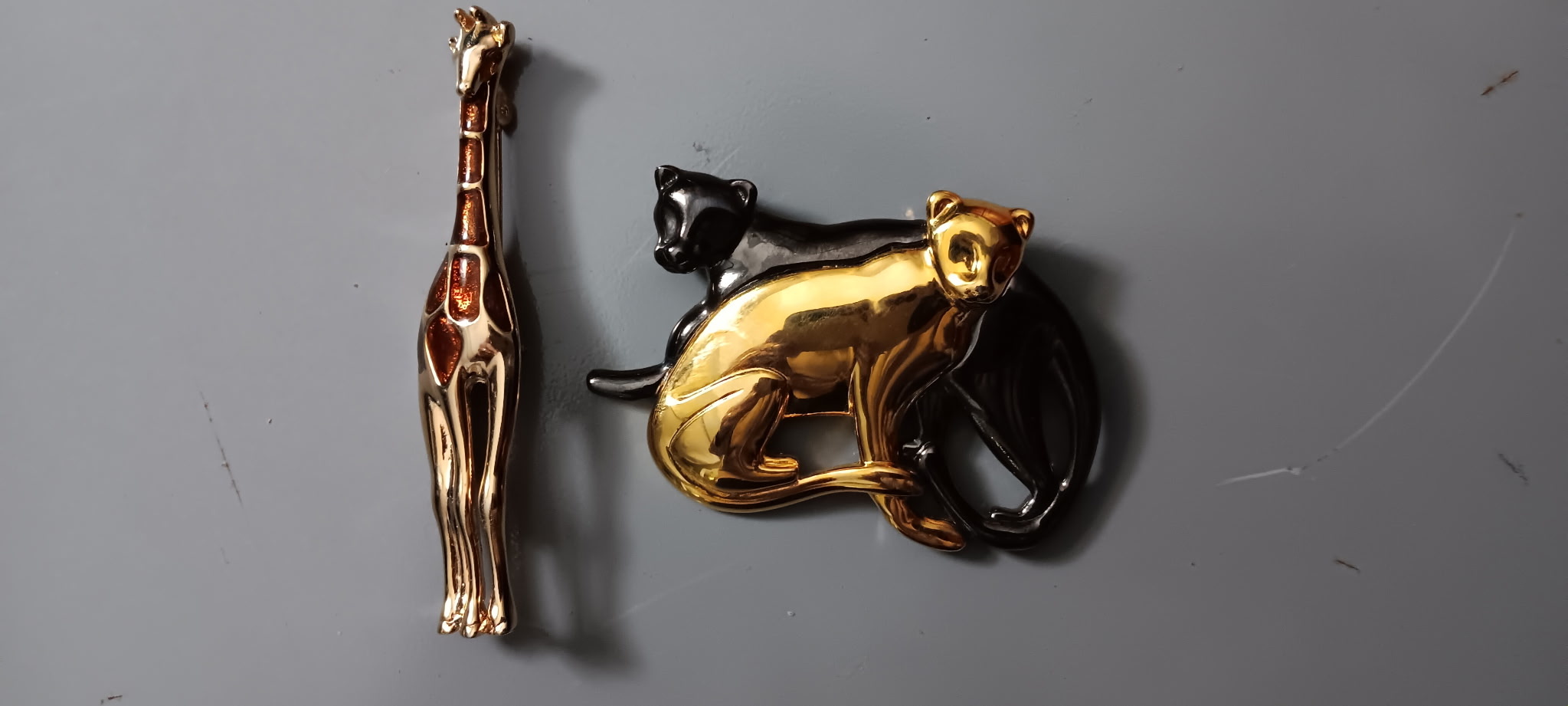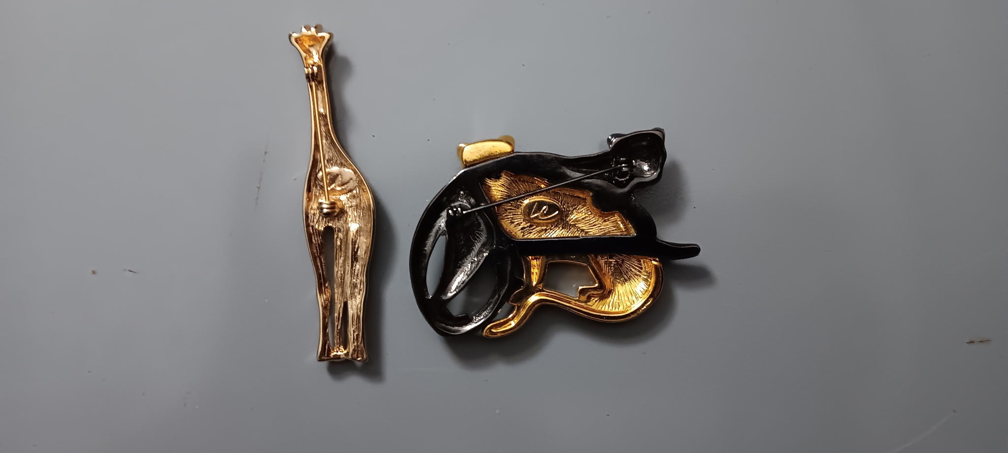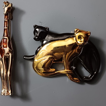 Found at goodwill this morning in eighties jewelry bin, two wild animal pins by Liz Claiborne with LC on other side. Golden with black and brown coloring
