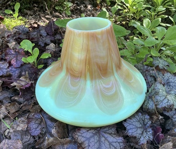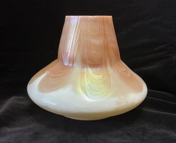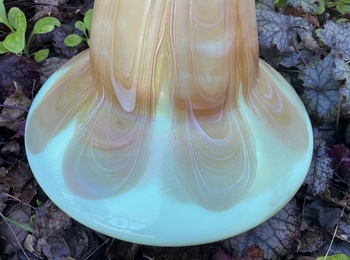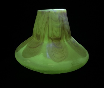 The vase is made from cased custard opaline glass with a uranium content that glows green under UV light. The outer casing has a pulled loop decor in light orange with an iridescent satin finish. The seller hadn’t mentioned the uranium content but I could tell by the slightly greenish custard tone that it was there.