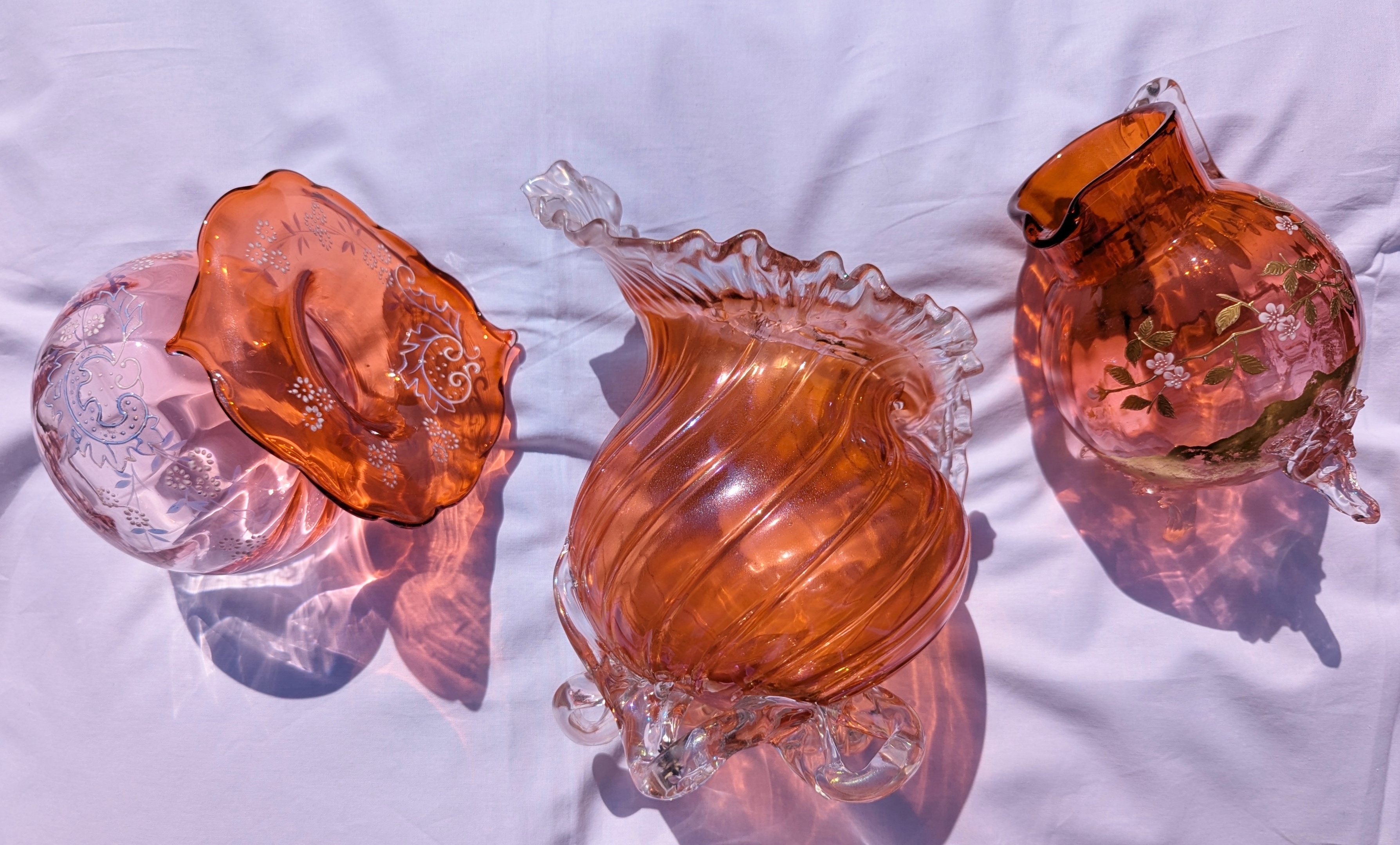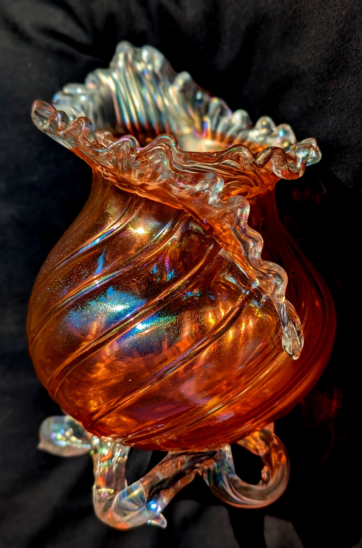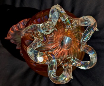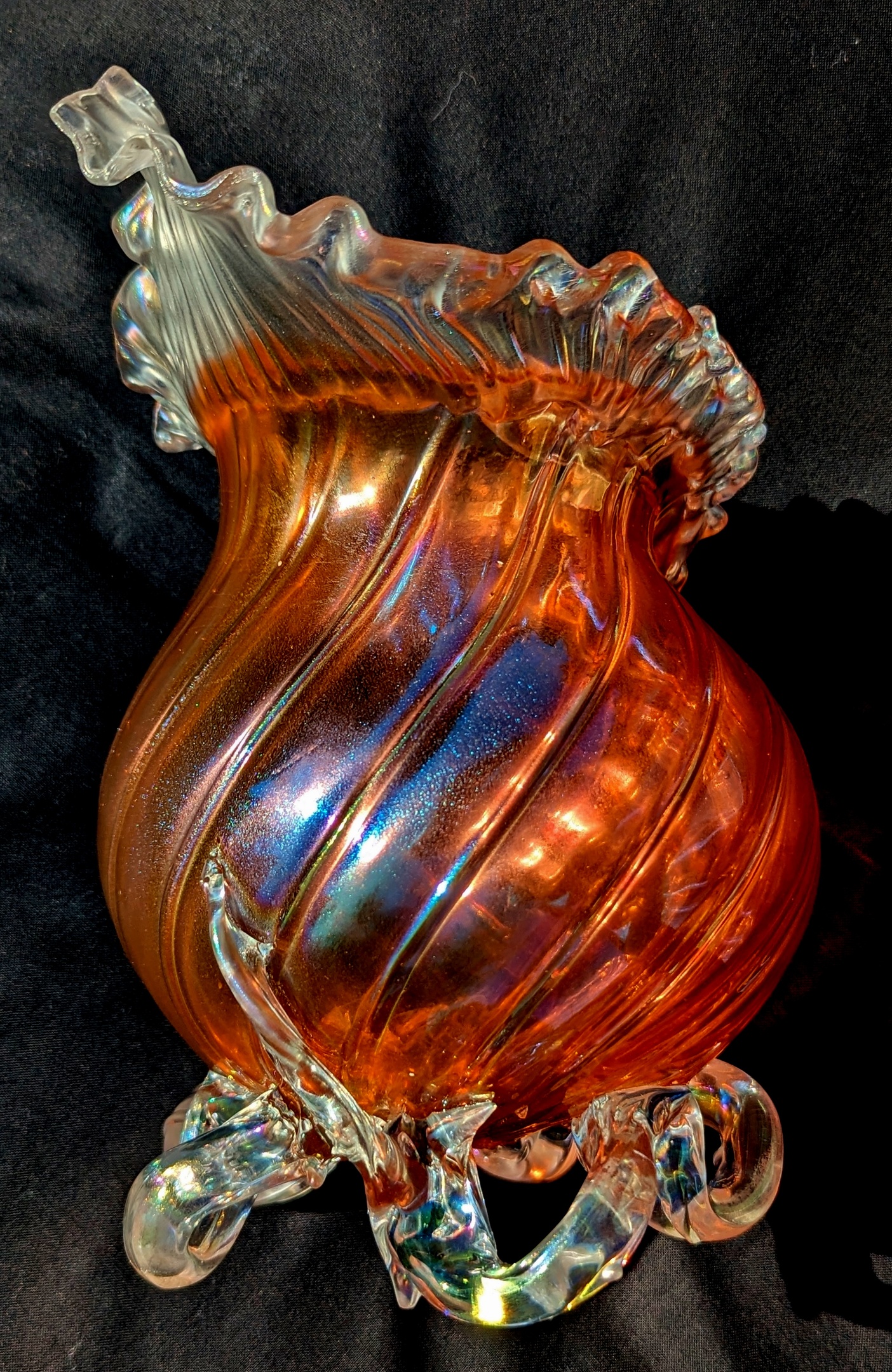 My vase has a compressed 'Jack in the Pulpit' like shape. The body is made of optically, diagonal ribbed clear glass coloured by a thin inner case of Makart (or possibly orange) glass. The extended, strongly folded rim (made by using a German so called 'Zwack-Eisen'), in a late Victorian style, is separately attached and the foot is formed by a thick five-fold waved thorny branch. The vase is highly iridized and exhibits a polished pontil. For a comparison of the color, I show in the last foto two similarly coloured Loetz items, a pitcher carrying a Dek=III/23 décor and another JIP-vase. In my CW-post stories/307759 a conch shell of same colour is dicussed. My vase is typical for the glass production of the late 1880's and of course the PN remains unknown. The vase stands H=21 cm, the complex shaped top rim is 17x12 cm, the body Dm=14 cm and the foot extends Du=13 cm. The vase weights 948 gr.