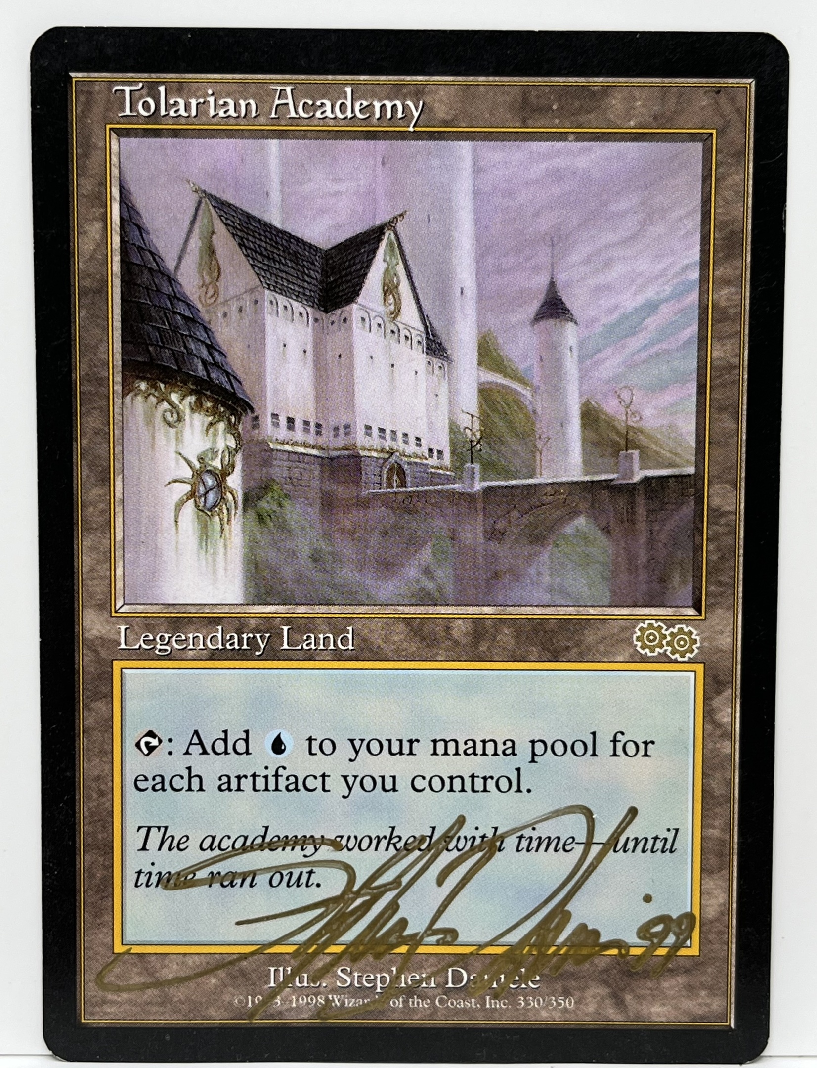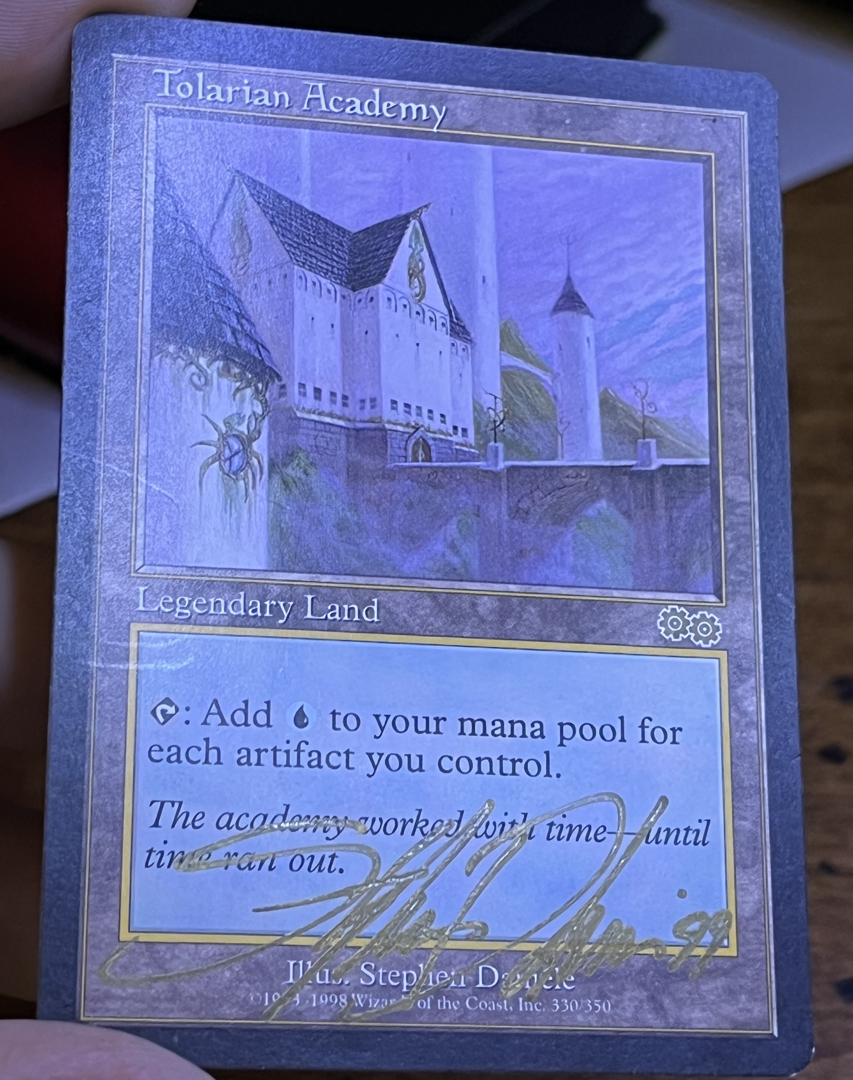 Nice little gem I found in a built brick of cards I bought at a thrift store. The Urza’s Saga Tolarian Academy signed and dated by the artist Stephen Daniele ‘99 in a gold ink marker. Rather nice condition for being found in a bulk brick bundle.