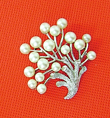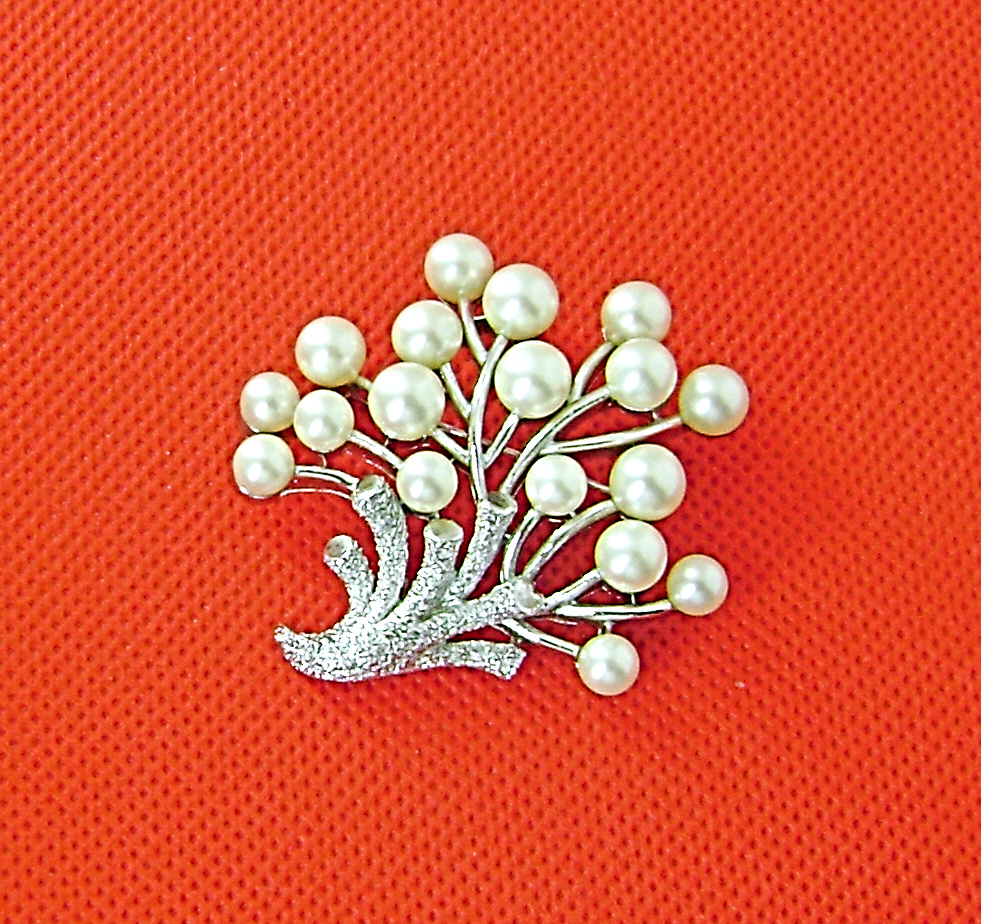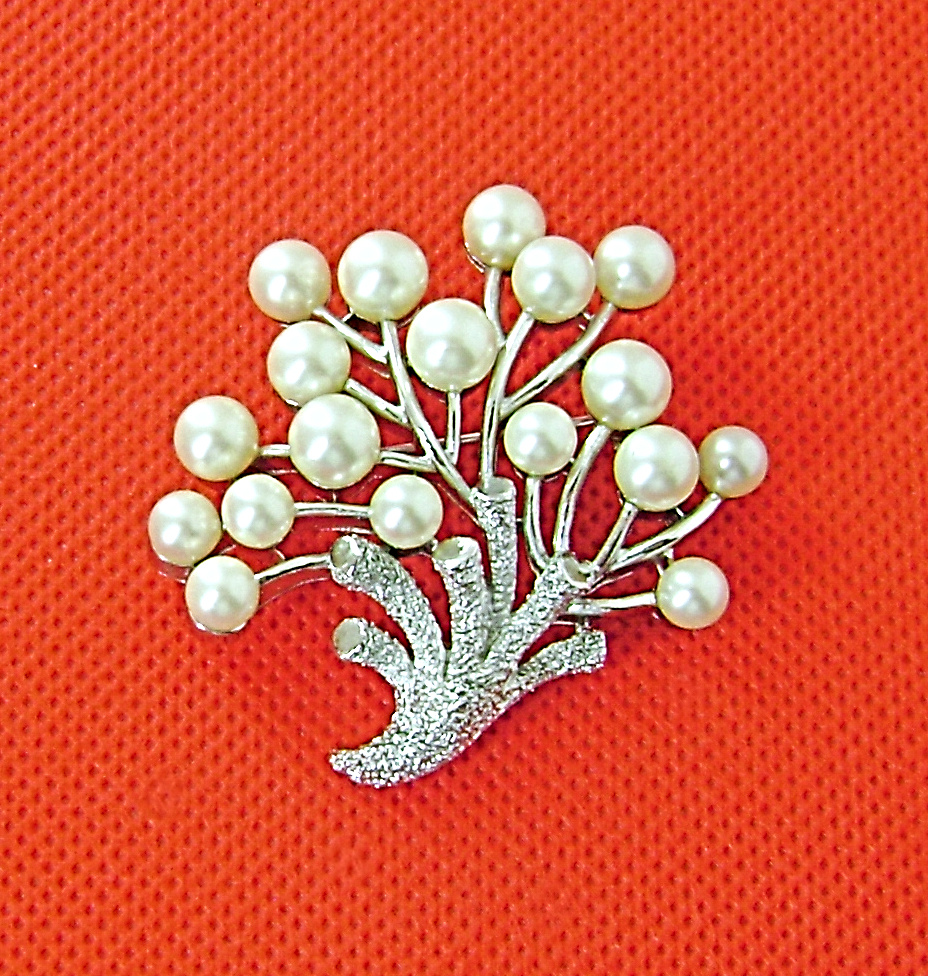 From The Under The Sea series is this simulated pearl coral brooch. In a texture and platinum tone. Measures 2" tall. 1967