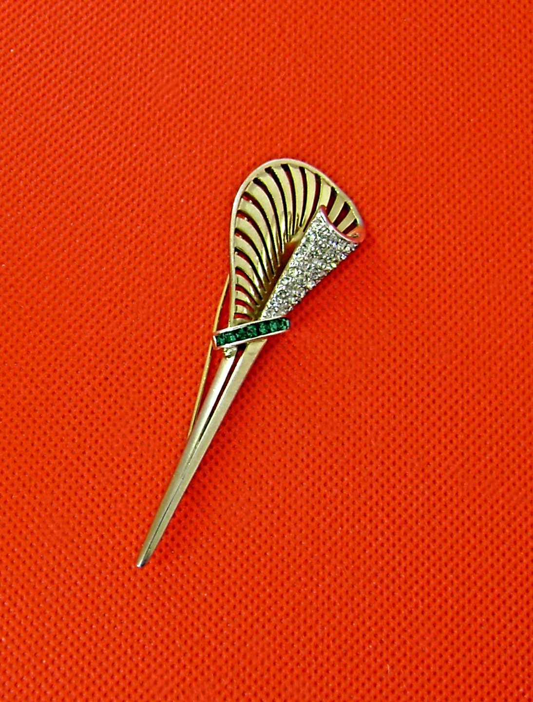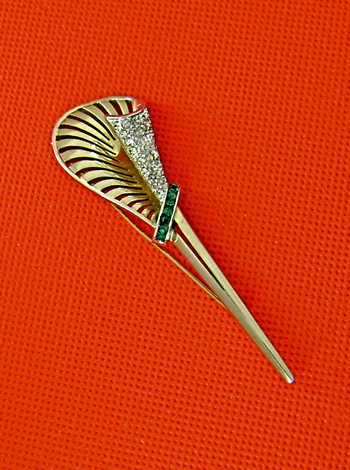 Vintage Boucher brooch. Polished gold tone and rhodium silver finish. With paved clear rhinestones and green baguettes. 3-1/4" tall. 1950's