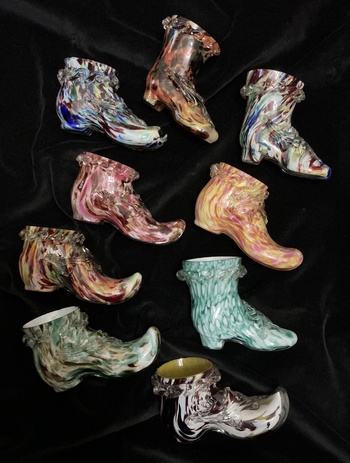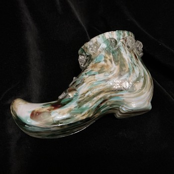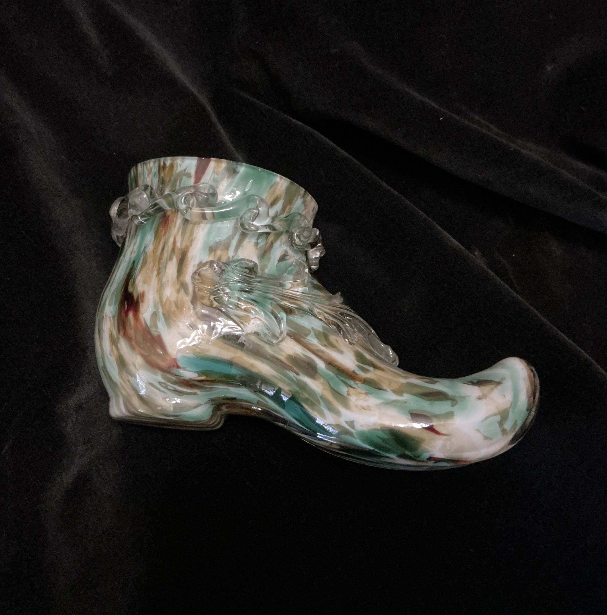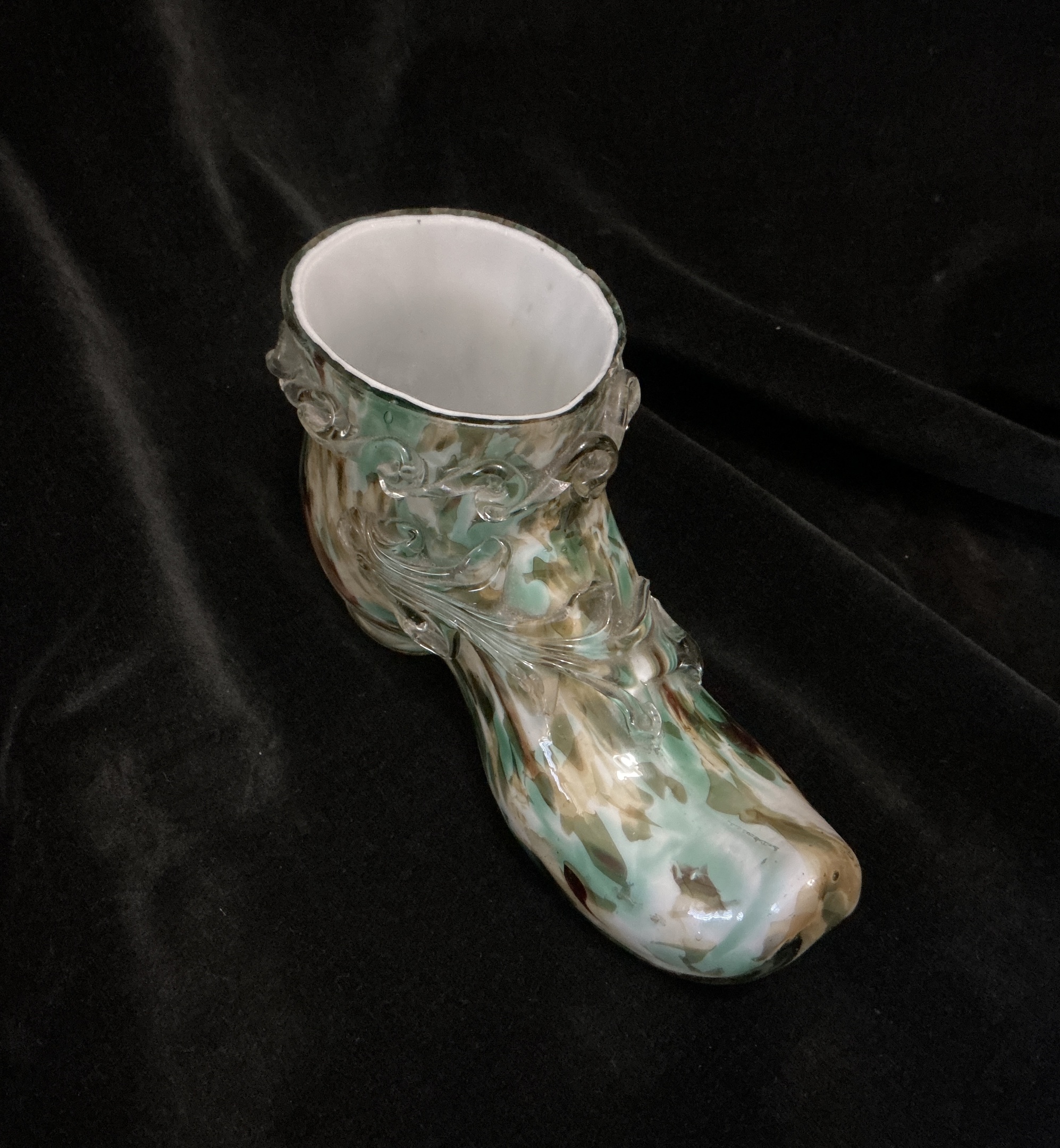 The latest addition has a spatter in shades of aqua blue & brown on a white ground. There is an applied clear acanthus leaf across the instep. It is the short boot.