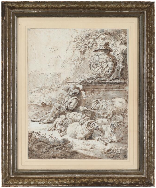 This signed pen drawing with wash on paper, 34 cm X 26 cm, is by successfull German artist Johann Heinrich Roos (1631-1685) and probably from ca. 1660. He specialized in pastoral idylls and longed for man and animals living together in harmony with nature. A number of museums have his paintings and drawings. Unfortunately he lost his life in a house fire, but his children survived. I bought the drawing at an internet auction. At British Museum they only have prints from etchings made after the drawing, which earlier has belonged to private collections in the UK and in Denmark. Enjoy.