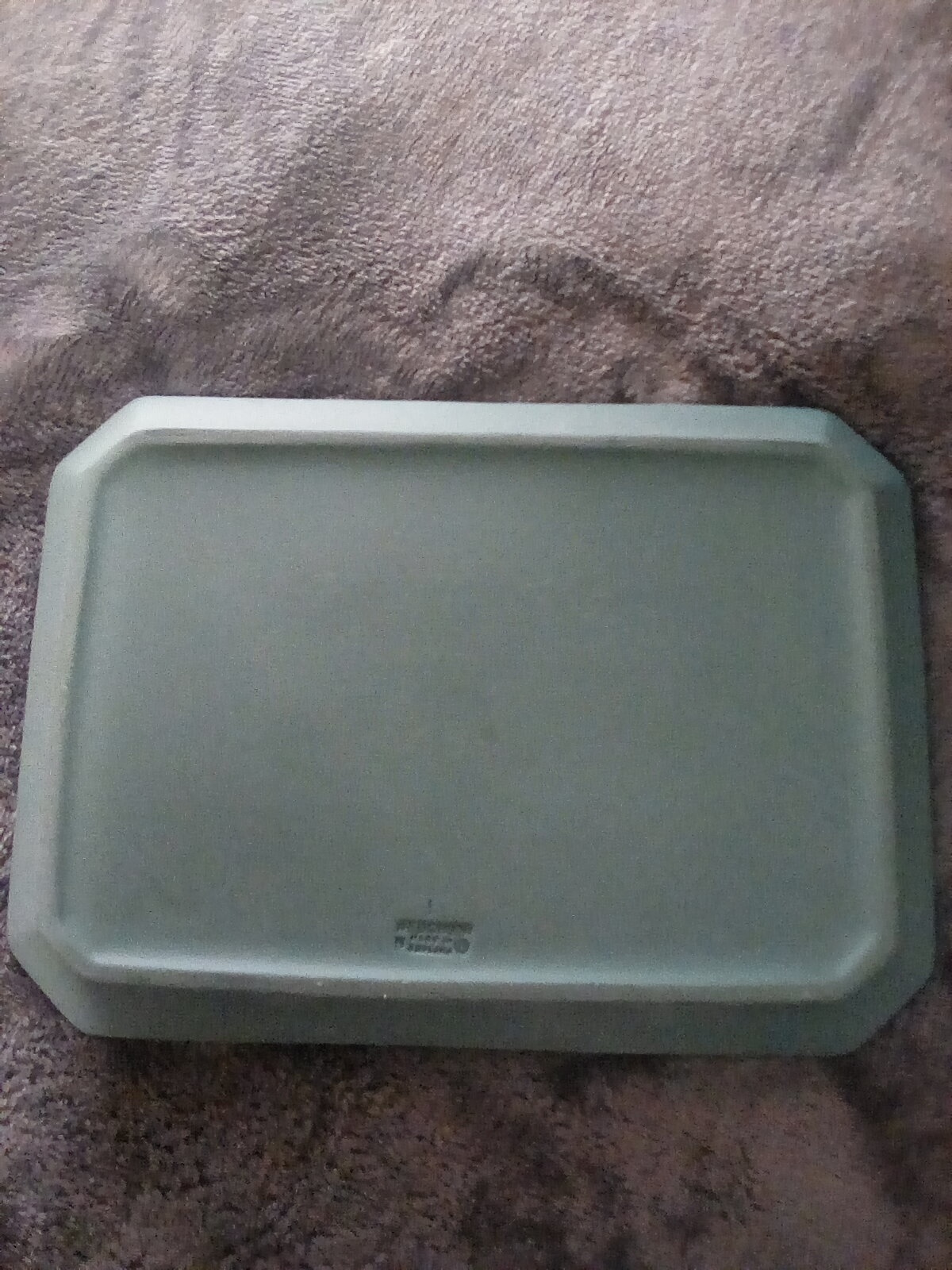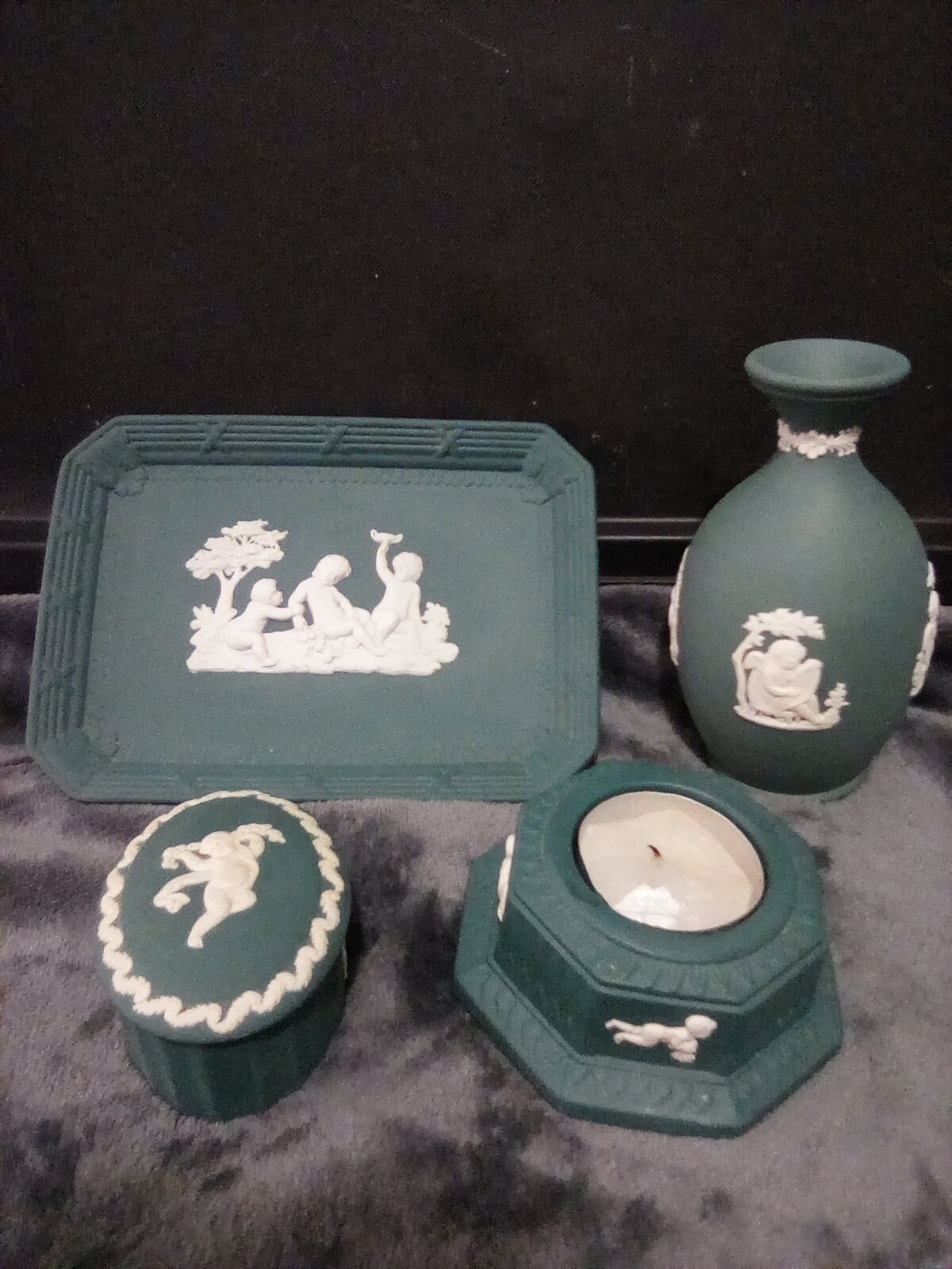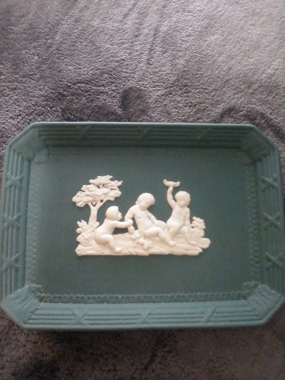 A teal or spruce green Wedgwood jasperware tray with three cherub babies, adding to my small colection. Wedgwood stamped