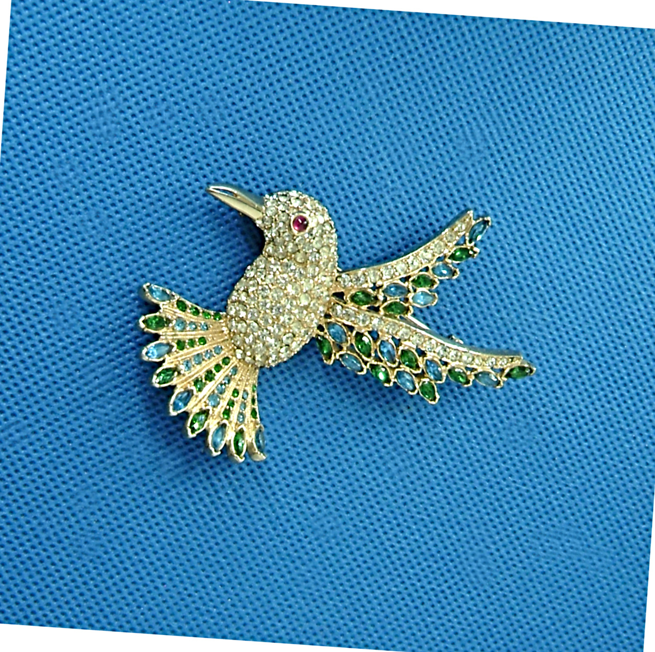 Hummingbird brooch. Covered in simulated diamonds. With faux sapphire and emerald chatons and marquise stones. A single red cabochon eye. 3" tall.