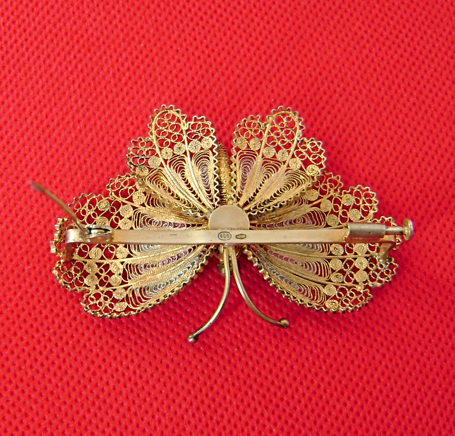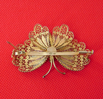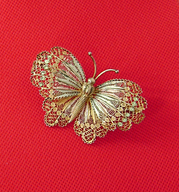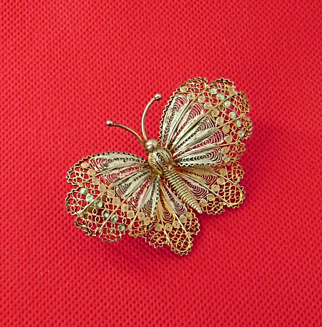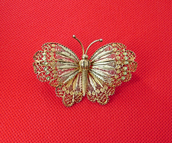 Butterfly pin. In a filigree and gold wash over silver. Victorian period, with trombone clasp. Found at a thrift store. 2-3/4" wide and 1-3/4 tall.