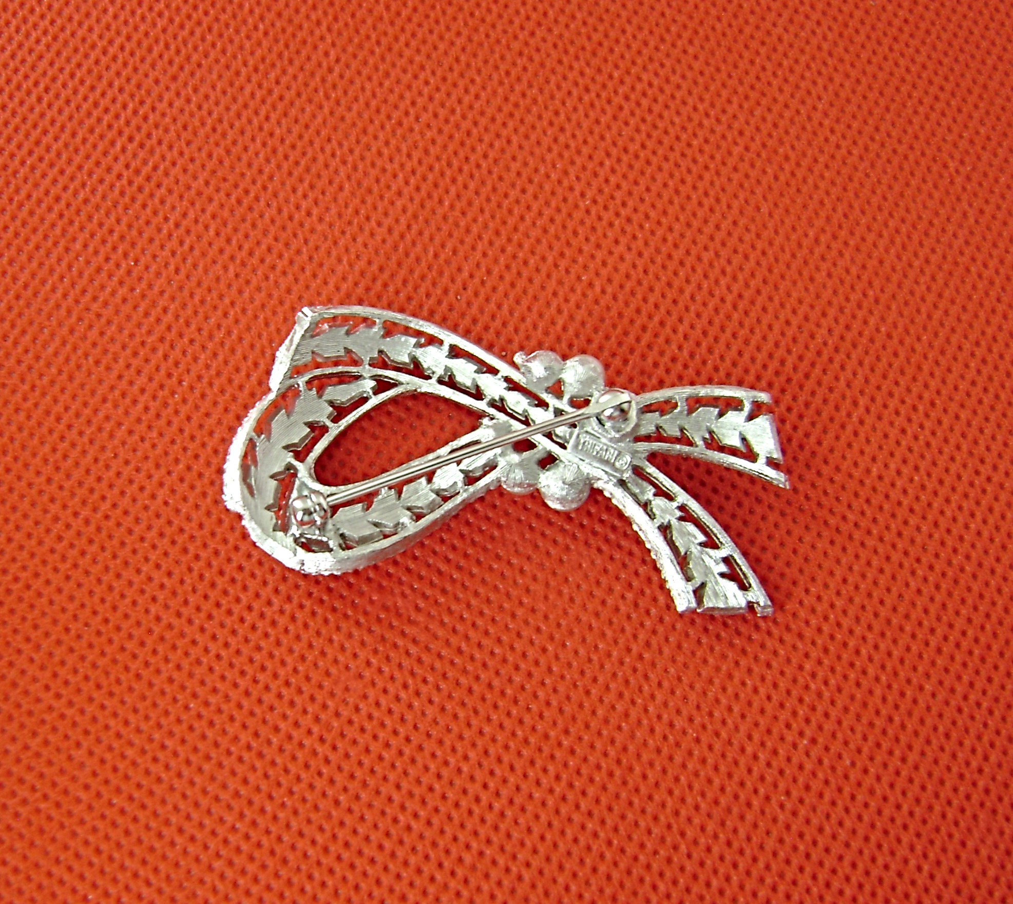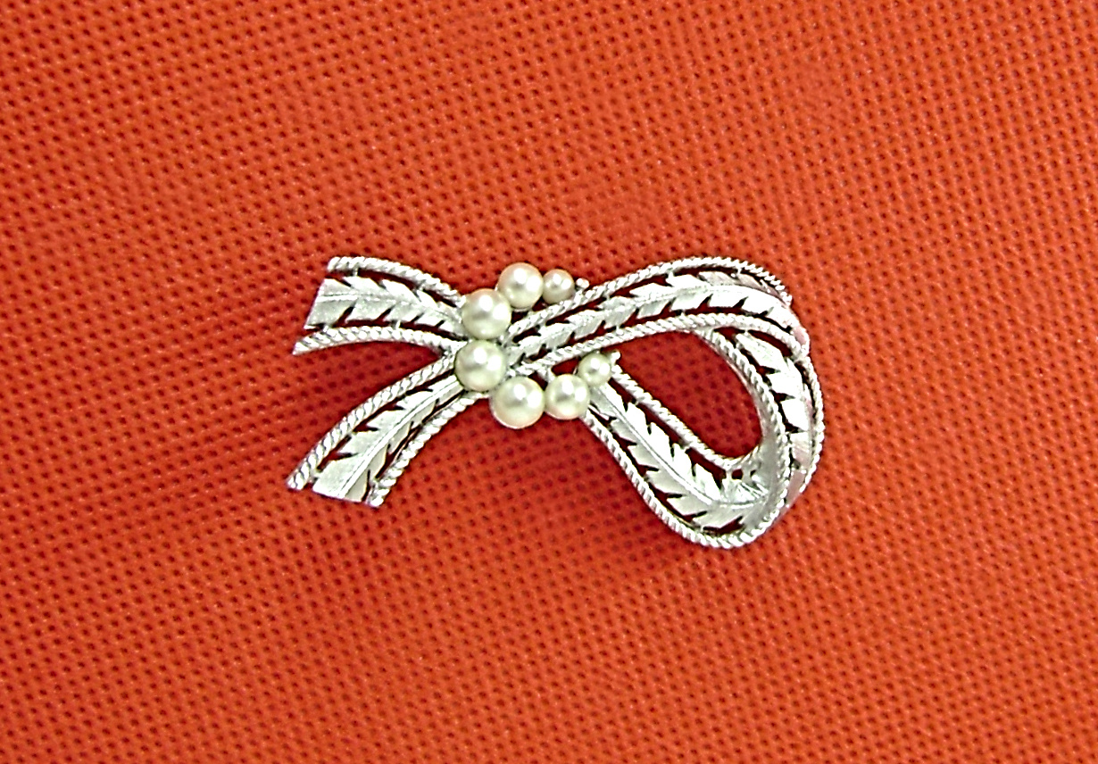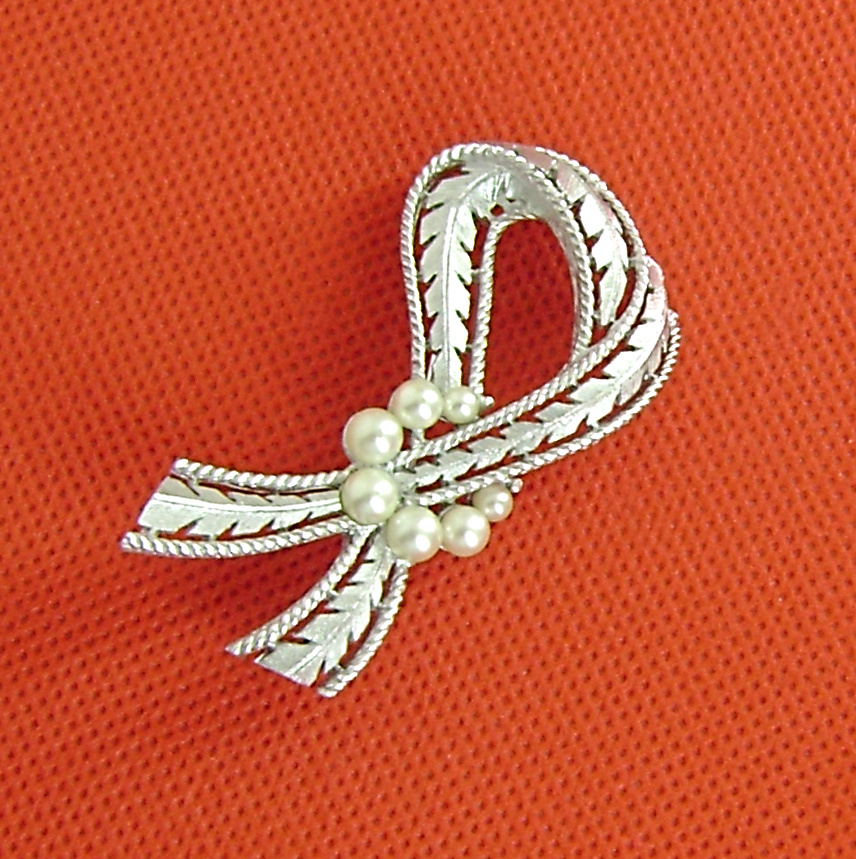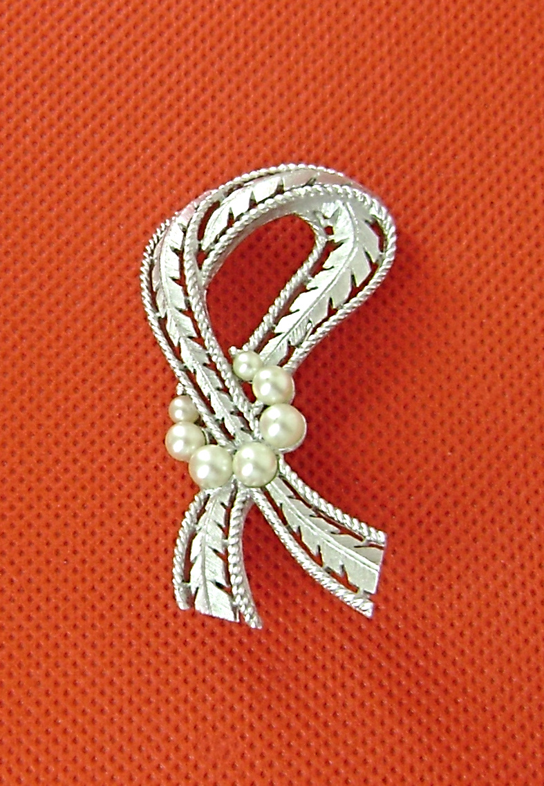 Trifari ribbon pin. With a center feather design and ring of simulated pearls. Platinum tone. 2-1/8" tall.