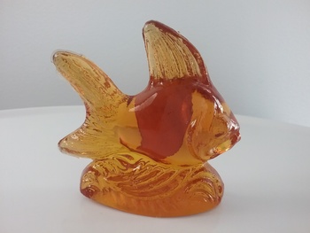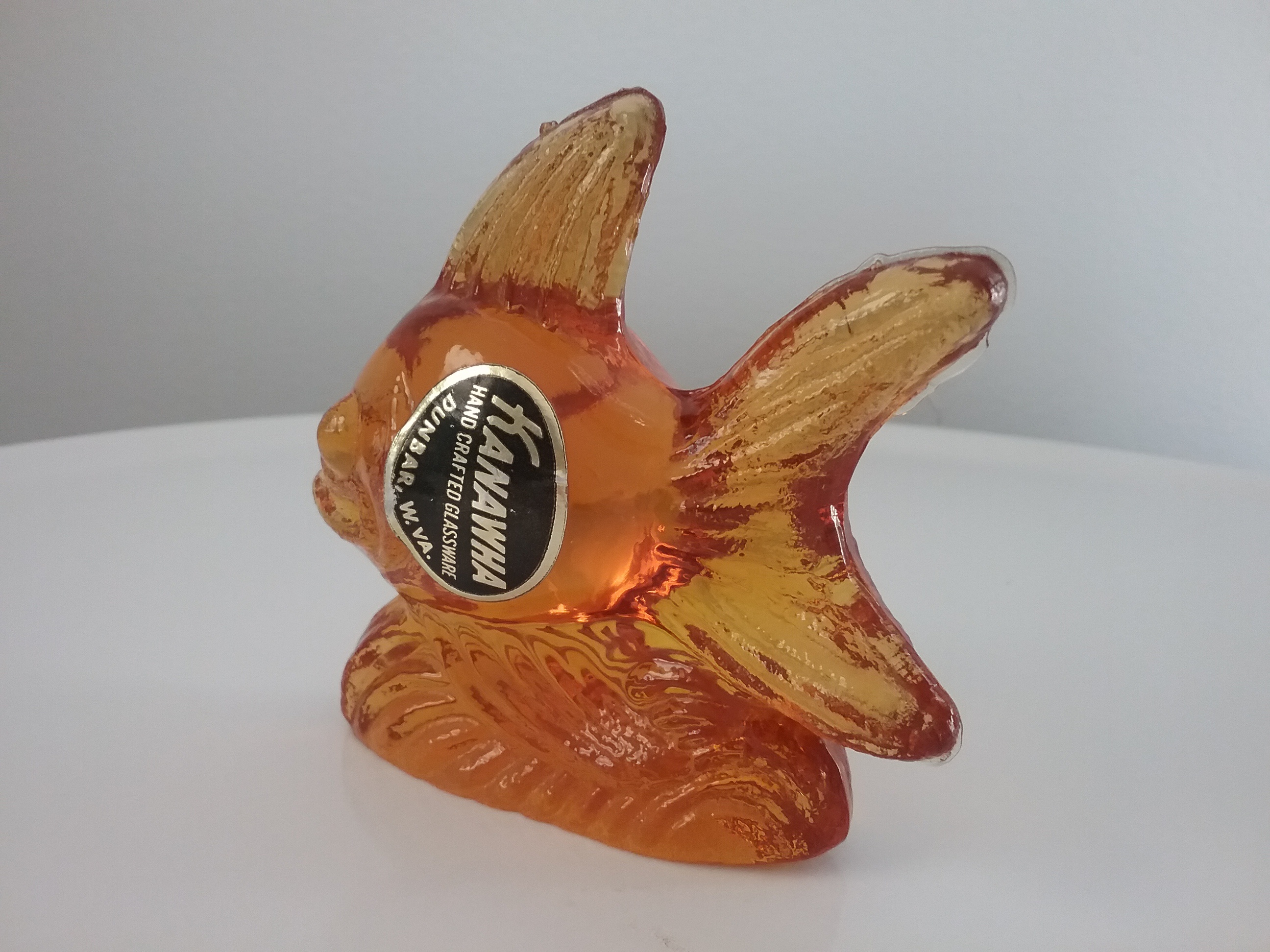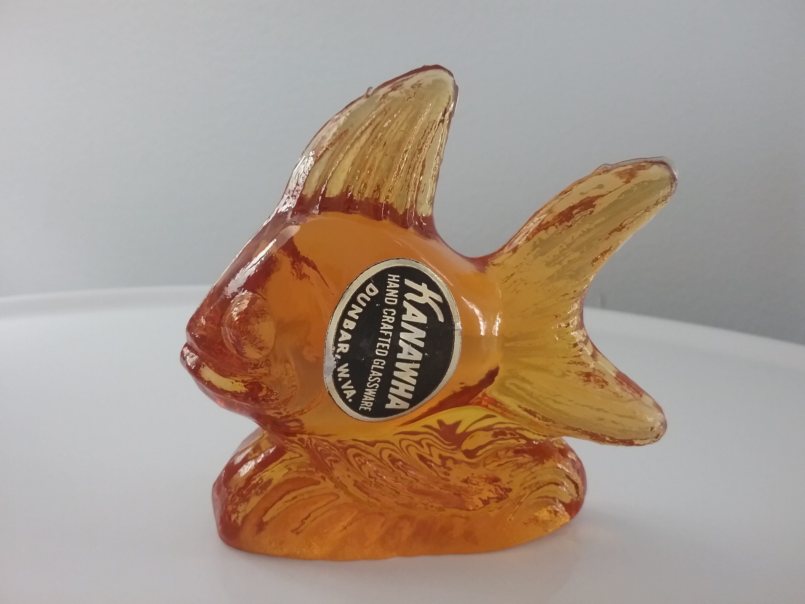 Here is a 4"W amber glass goldfish sitting on a wavy ocean base, made by Kanawha Glass of Dunbar WV, with orig gold & black label, one of their window glass animals ca 70s-80s