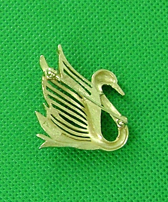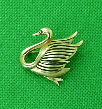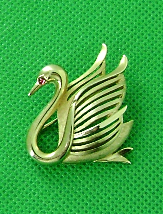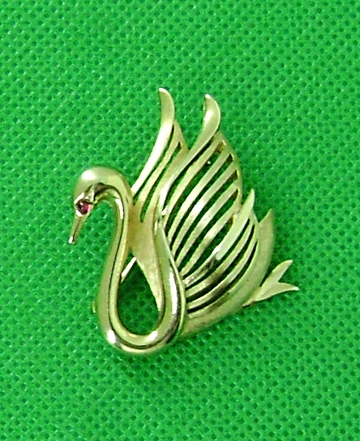 Trifari swan pin. With wings, neck, and feet in a swimming position. Has a single red cabochon eye. Gold tone. 1-1/2" tall.