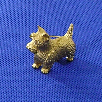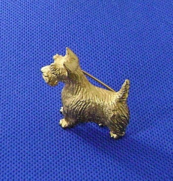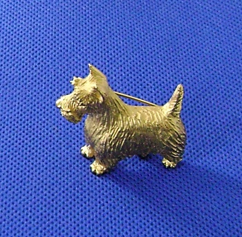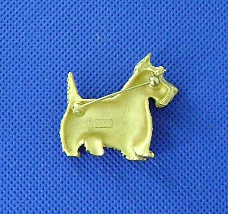 Trifari dog pin. From the Canine series is this Scottish Terrier. Sculpted in gold tone. Measures 1-1/2" tall. 1970's