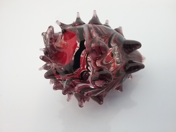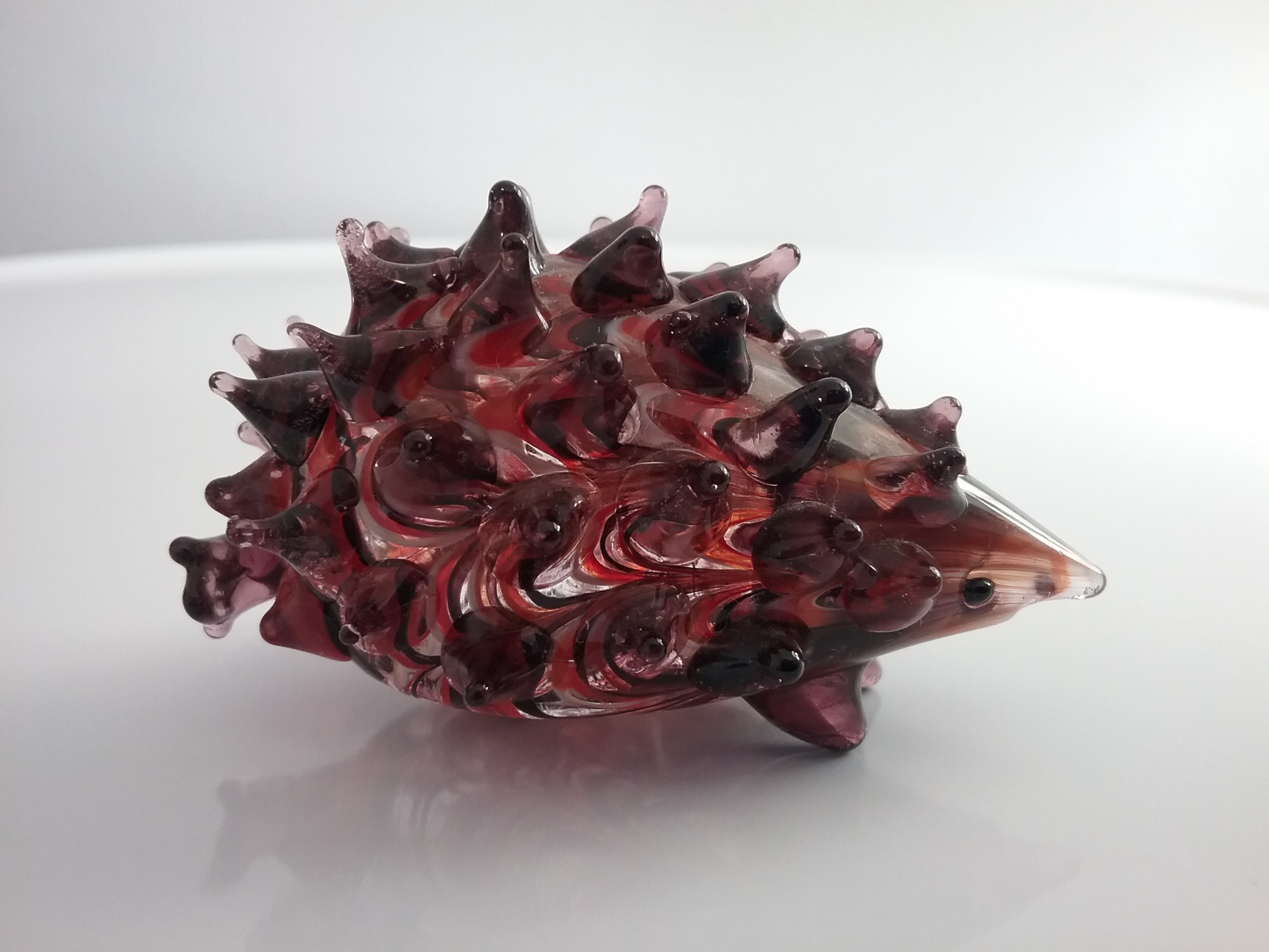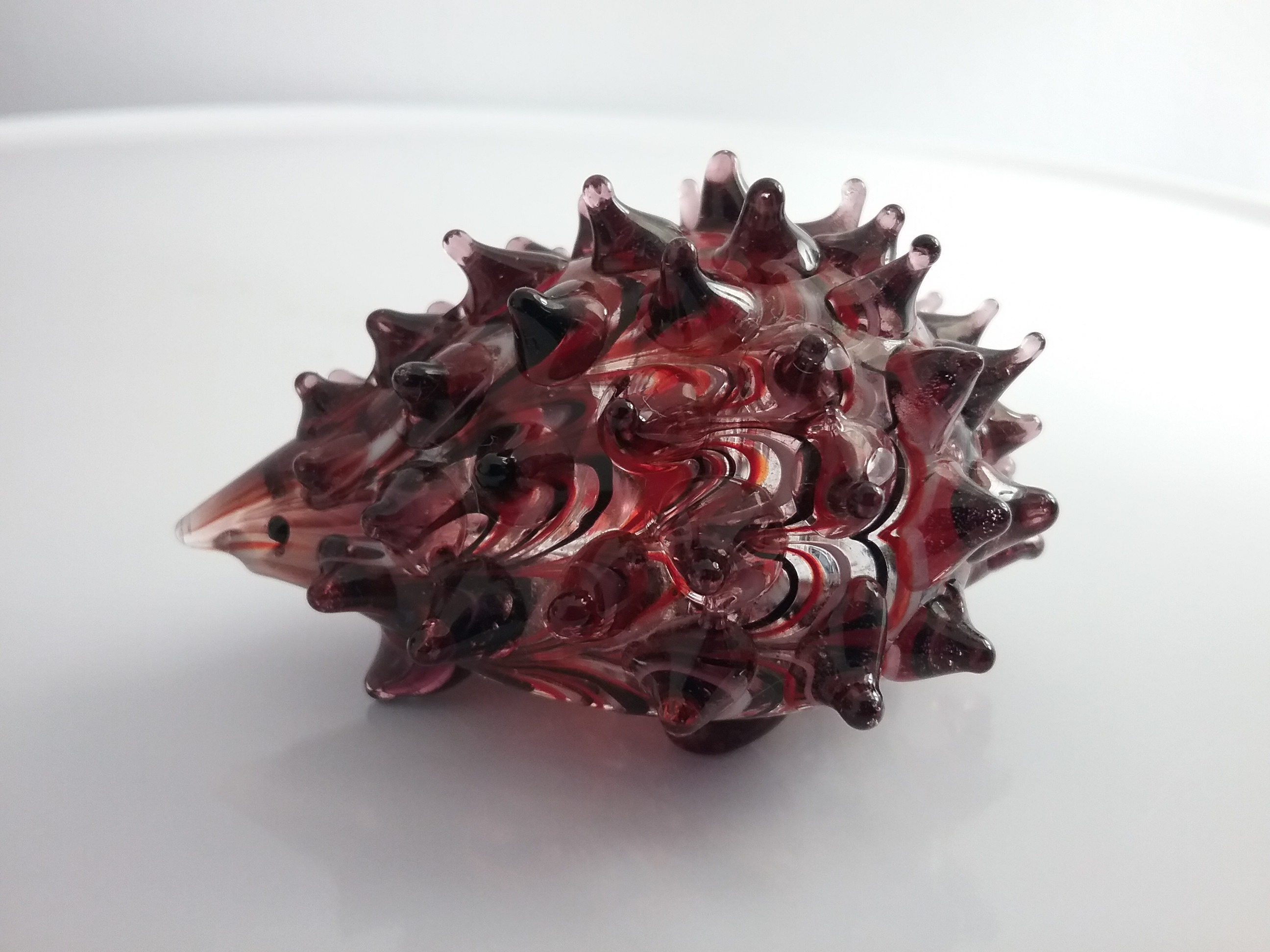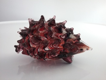 Here is a 3"W brown glass hedgehog with white, red & black swirl design, made by Fitz and Floyd of Dallas TX from their Glass Menagerie series, with orig FF label on the bottom