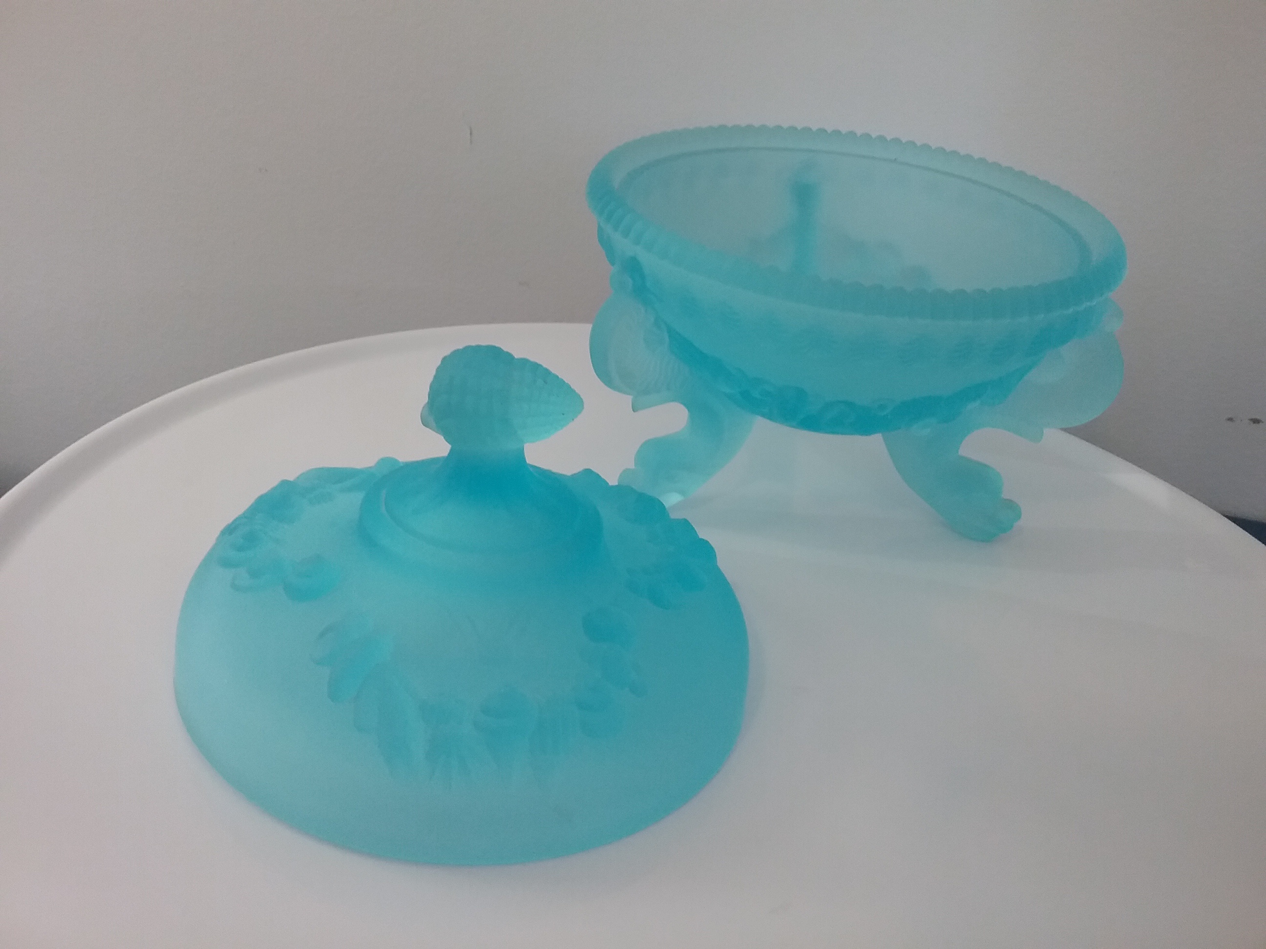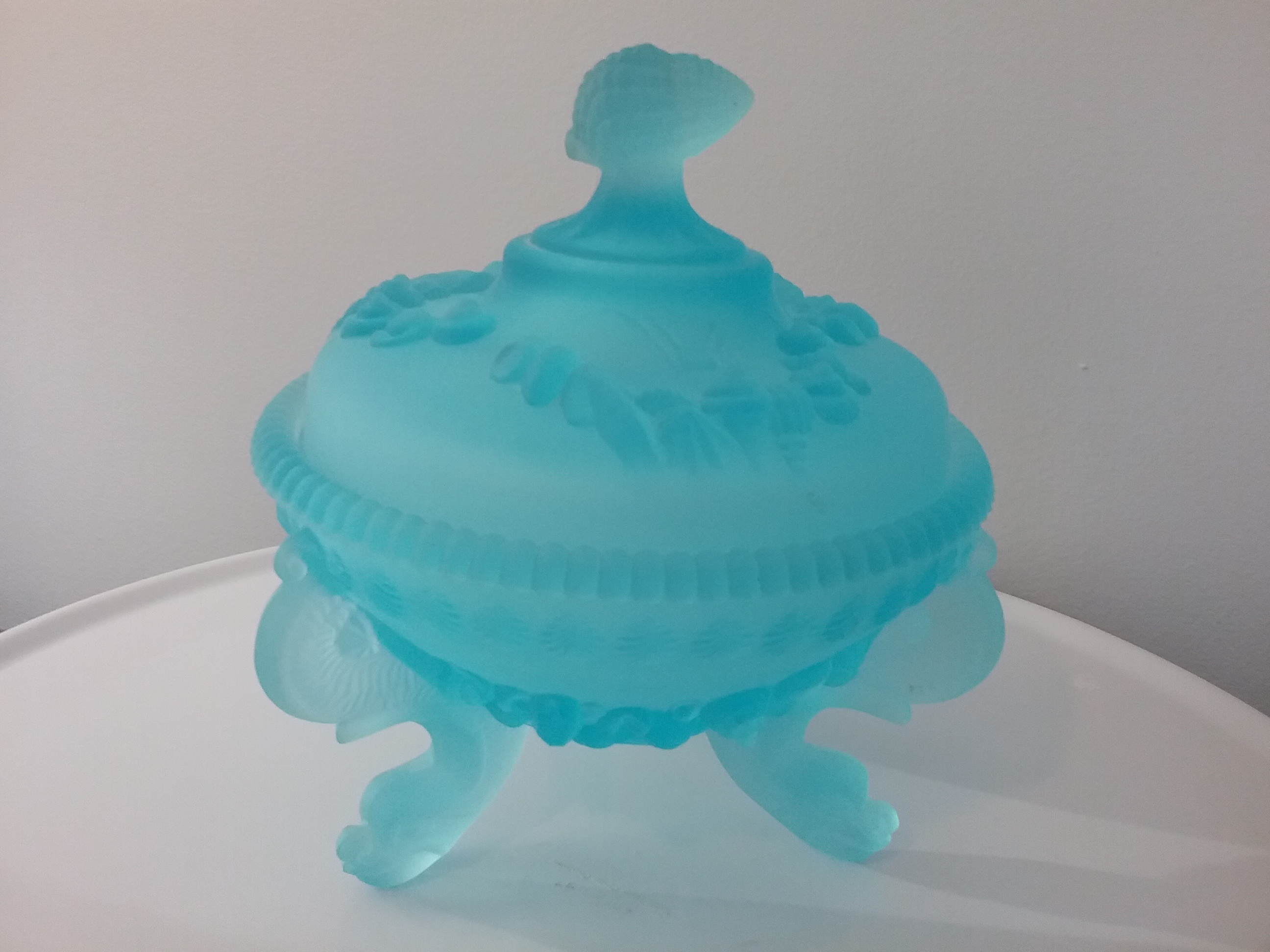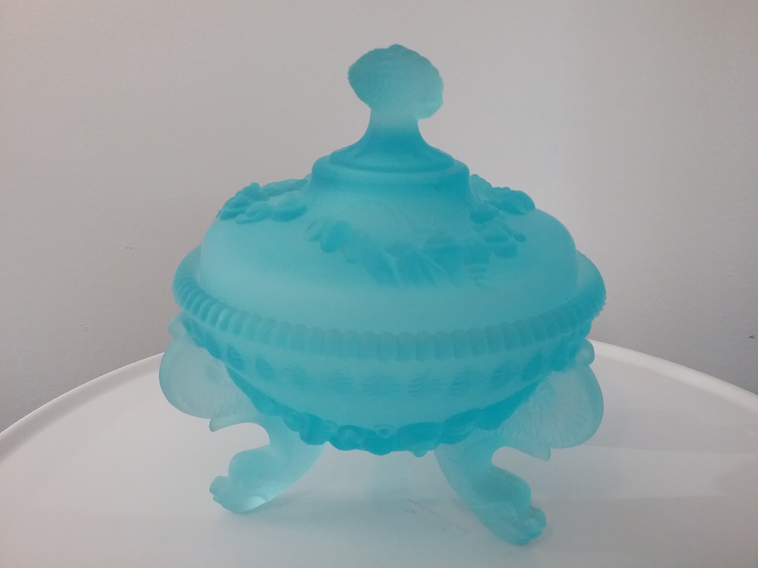 Here is a 7 1-2"H aqua blue satin glass covered dish with seashell & argonaut lid, shells around base and three dolphin feet. Originally made in milk glass, colors reissued in the 1960s. The W with C raised logo imprint is for the Westmoreland Glass Collector Club