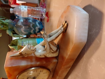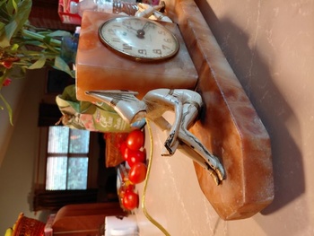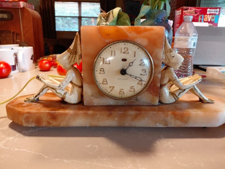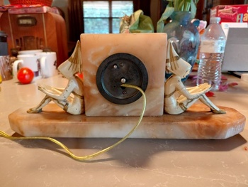 Two more little studious imps, setting yet again by a clock. They are in good shape for their age a little paint flexing. The clock movement is a New Haven movement as are his clocks before 1928 when he switched to the Hammond Clock Co. The clock runs, but the flick to start knob is iffy.