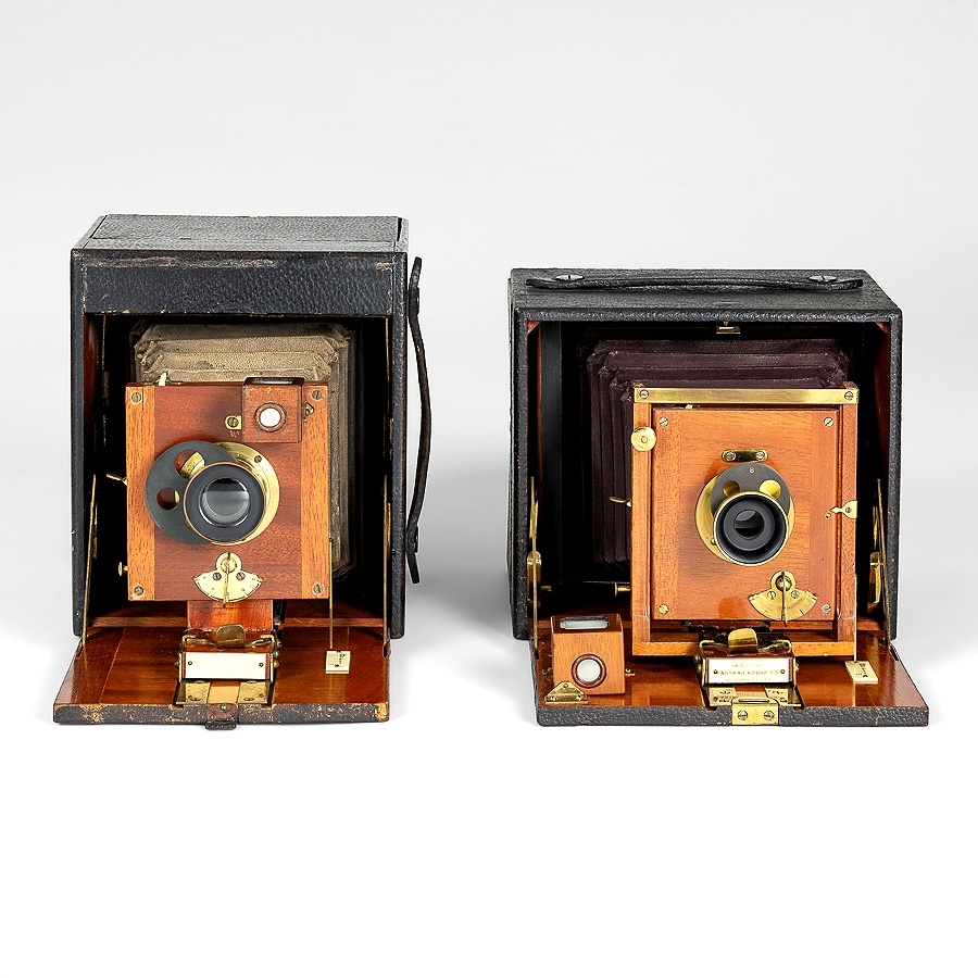 This example has a polished wood bed and finder, and an internal double-swing back. Otherwise, most vertical models have black drop beds and finders. Kodak's production orders, catalogues, and adverts do not differentiate the build variations, and one of my research goals is to figure out if there is a pattern to the design changes.