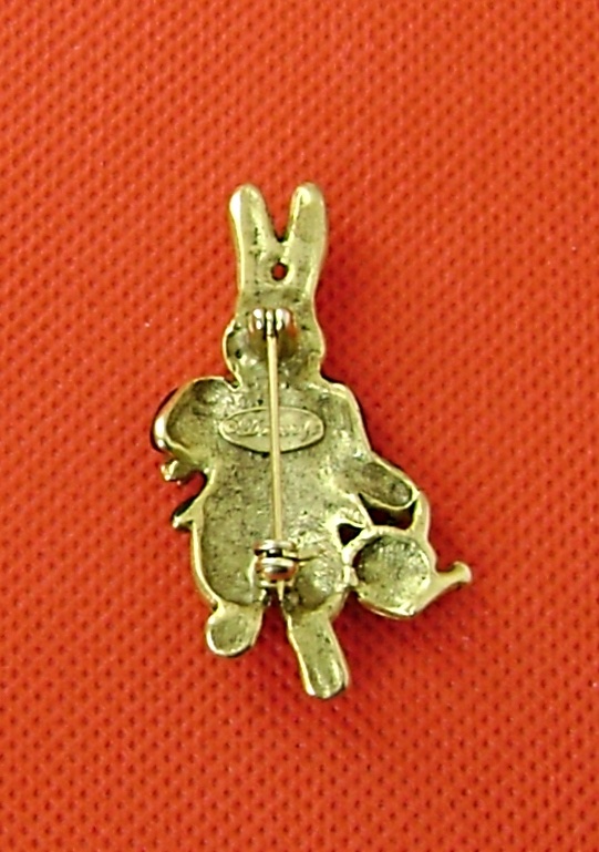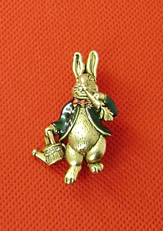 Danecraft Rabbit Brooch. In green and red enamel. With carrot and watering can. 2" tall. 1980's. Found for $1.00