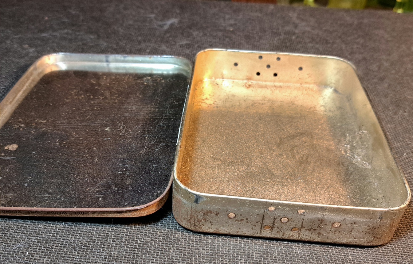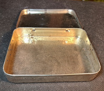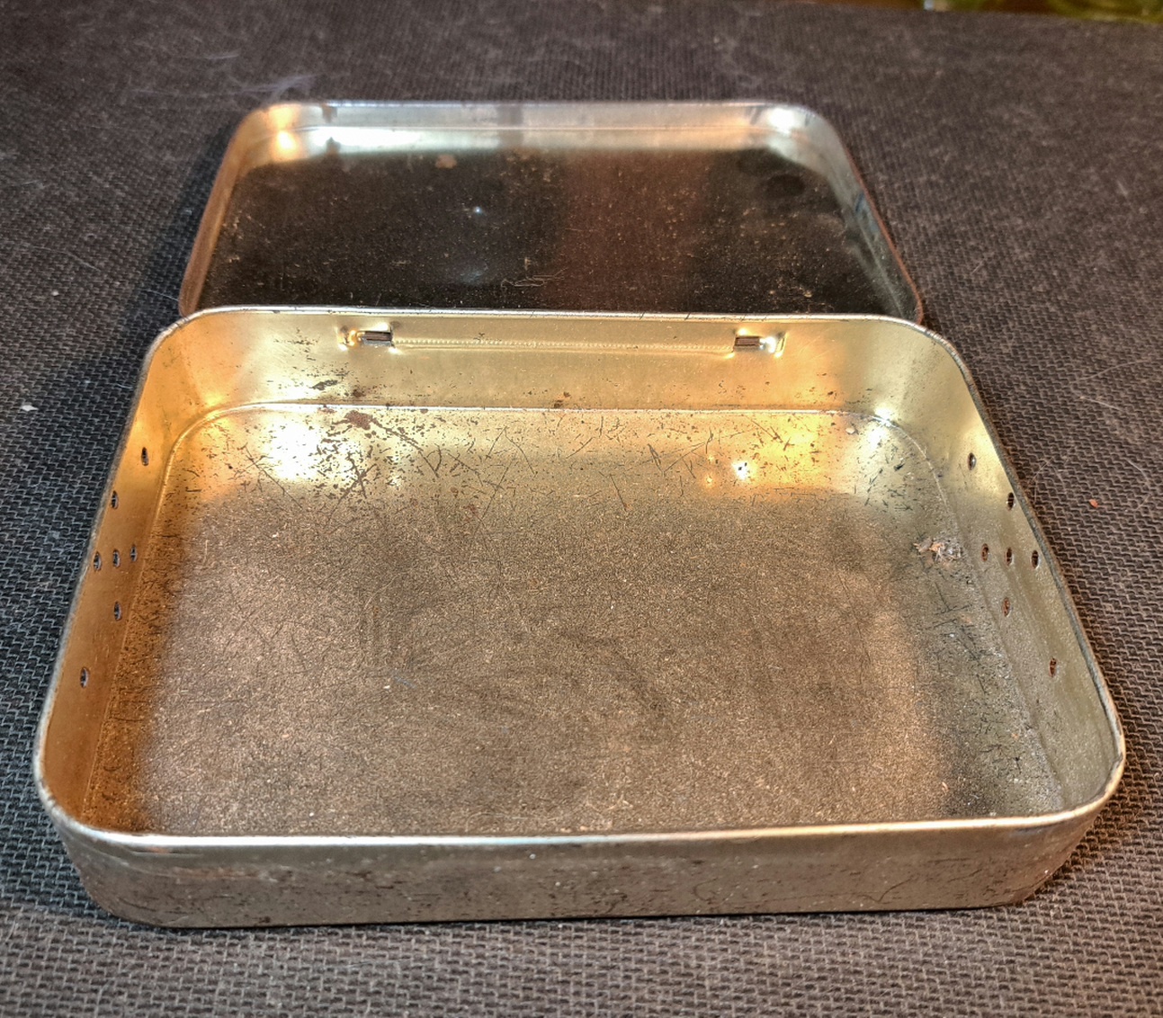This is a small tin at 4 1/2 × 6 1/2 inches. The sides are perforated. The only information on age is that it is pre 1971