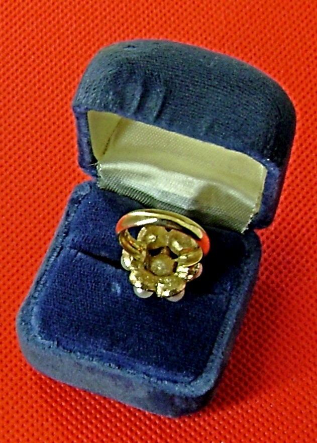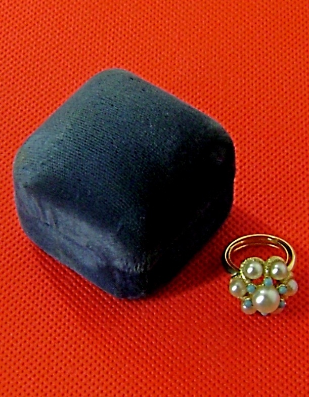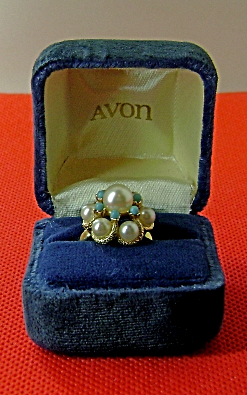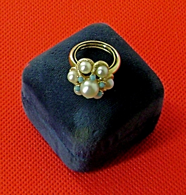 This cocktail ring is by Trifari for Avon. With simulated pearls and turquoise beads. Gold tone. It's adjustable to fit size 5 - 7. From 1972